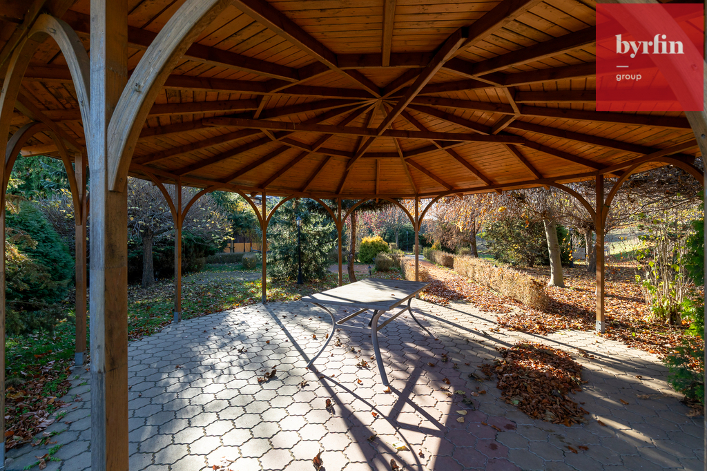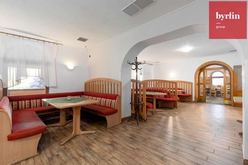 Areál tvoří třípodlažní budova s restaurací, ubytovací částí, skladovým a technickým zázemím, dvěma terasami a rozsáhlou okrasnou zahradou. Hlavní část slouží jako restaurace s kompletně vybavenou kuchyní, barem a sociálním zázemím. V 1. patře se nachází 12 pokojů, každý s vlastní koupelnou a WC, aktuálně pronajatých dlouhodobým nájemcům se stabilním příjmem cca 120.000 Kč měsíčně. V podkroví jsou dvě bytové jednotky o velikosti cca 70 m², ideální pro majitele, správce nebo dlouhodobý pronájem.