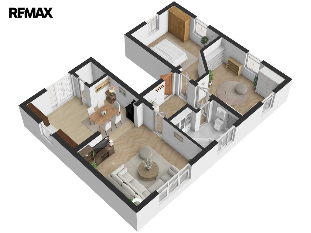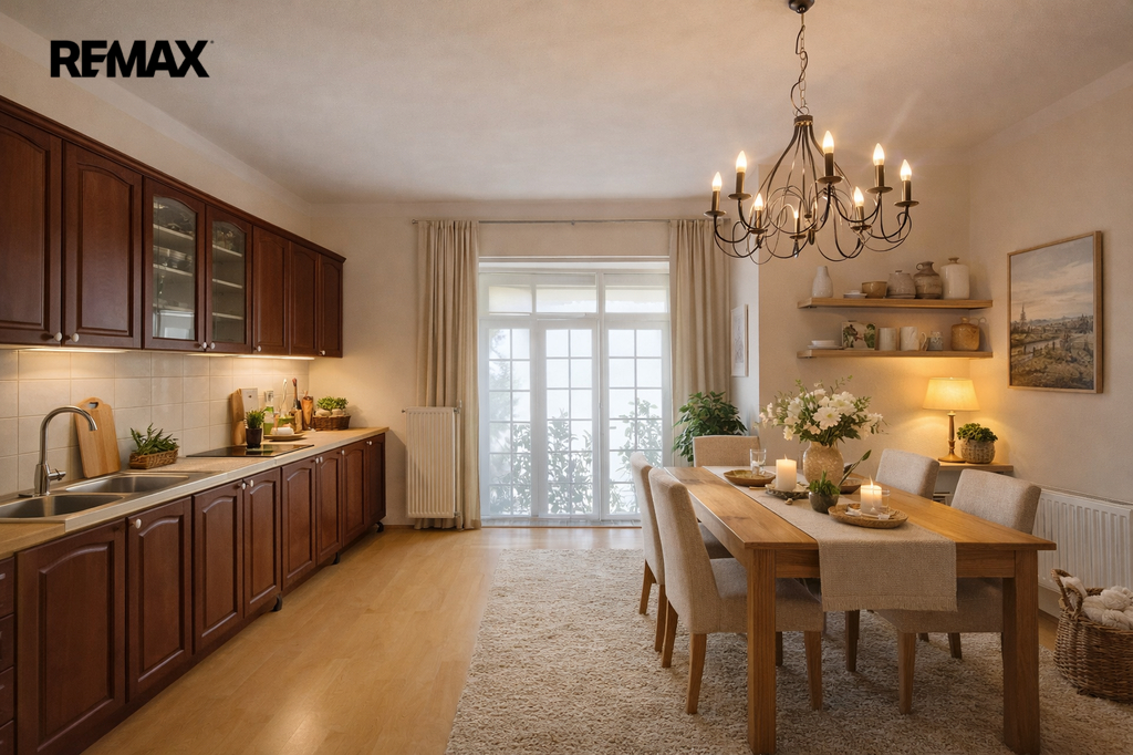 Velkou předností bytu je velkorysý prostor a praktické dispoziční řešení, které nabízí dostatek místa jak pro rodinný život, tak pro pohodlné každodenní fungování. Dominantou bytu je prostorná kuchyně s jídelní částí, kde se přirozeně setkává rodina i přátelé.
