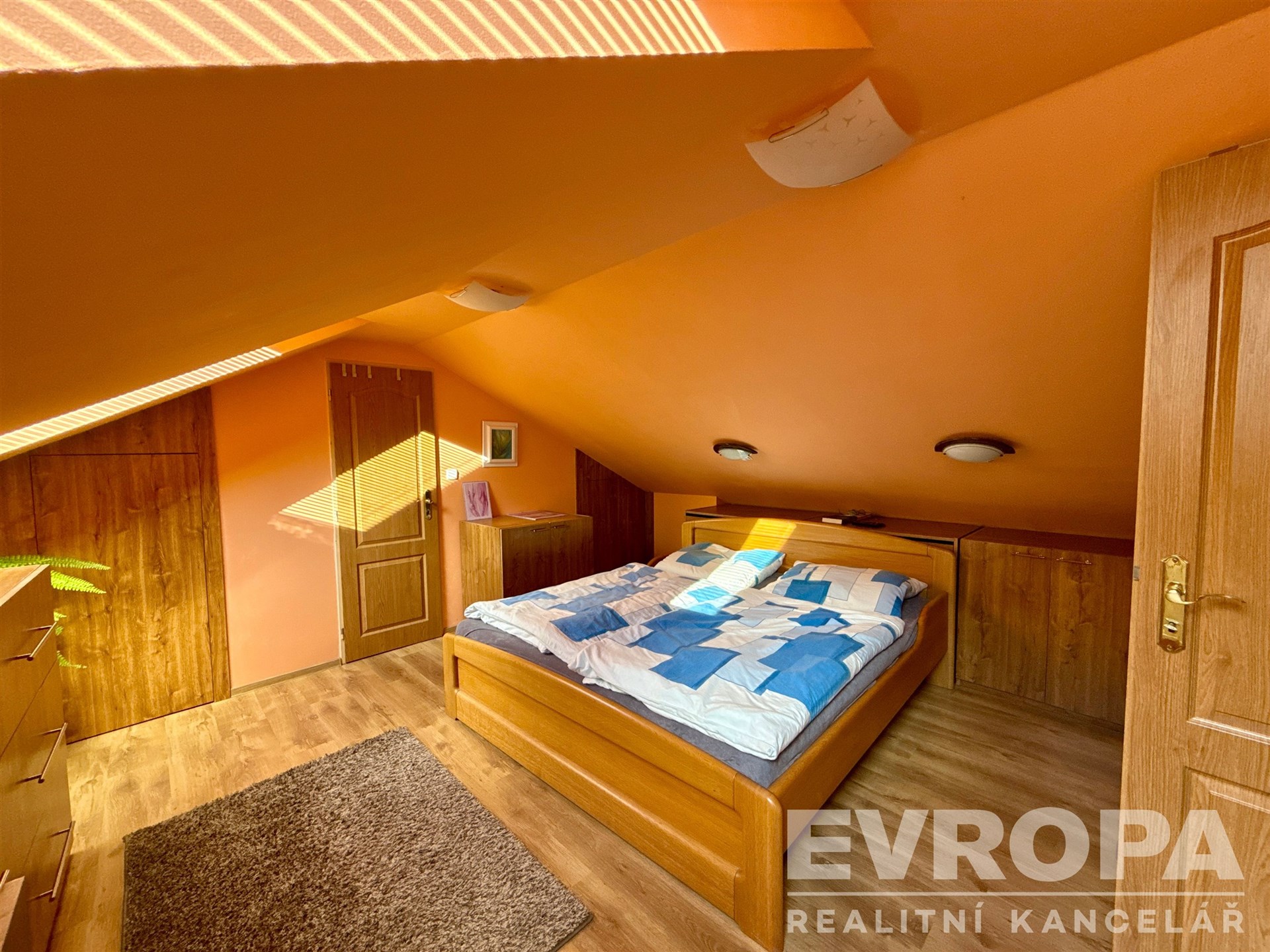 V podkroví naleznete prostornou ložnici se dvěma střešními okny orientovanými na jih a vlastní koupelnu s toaletou – váš osobní soukromý svět, kde najdete klid a pohodu.