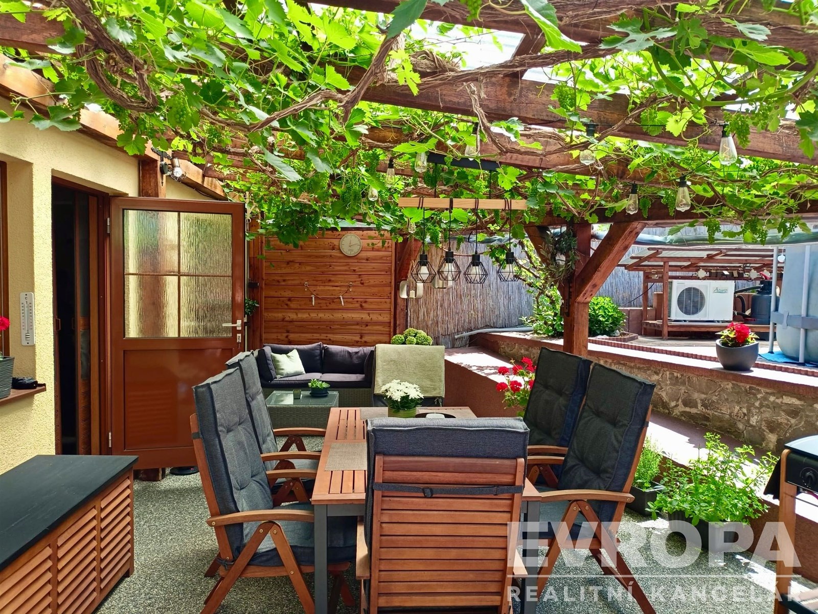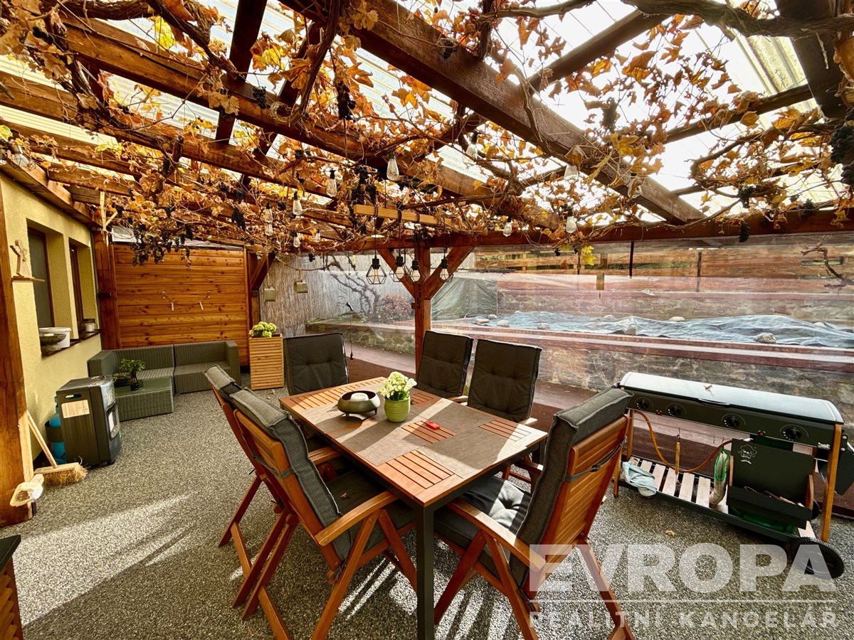 Z kuchyně vycházíte přímo na prostornou zastřešenou pergolu orientovanou na jih, která je celá obrostlá hroznovým vínem – ideální místo pro ranní kávu se zpěvem ptáků, letní grilovaní s přáteli, rodinné obědy na čerstvém vzduchu. Hned vedle pergoly je prostor, kde můžete v létě nejen pro děti umístit bazén, jako stávající majitelka.