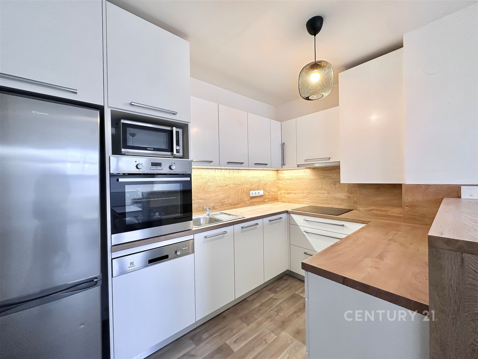 Špičková kuchyně: Designová bílá linka s vestavnými spotřebiči (trouba, mikrovlnná trouba, indukční deska, myčka) disponuje elegantním barovým pultem, který přirozeně propojuje varnou zónu s obývacím prostorem.