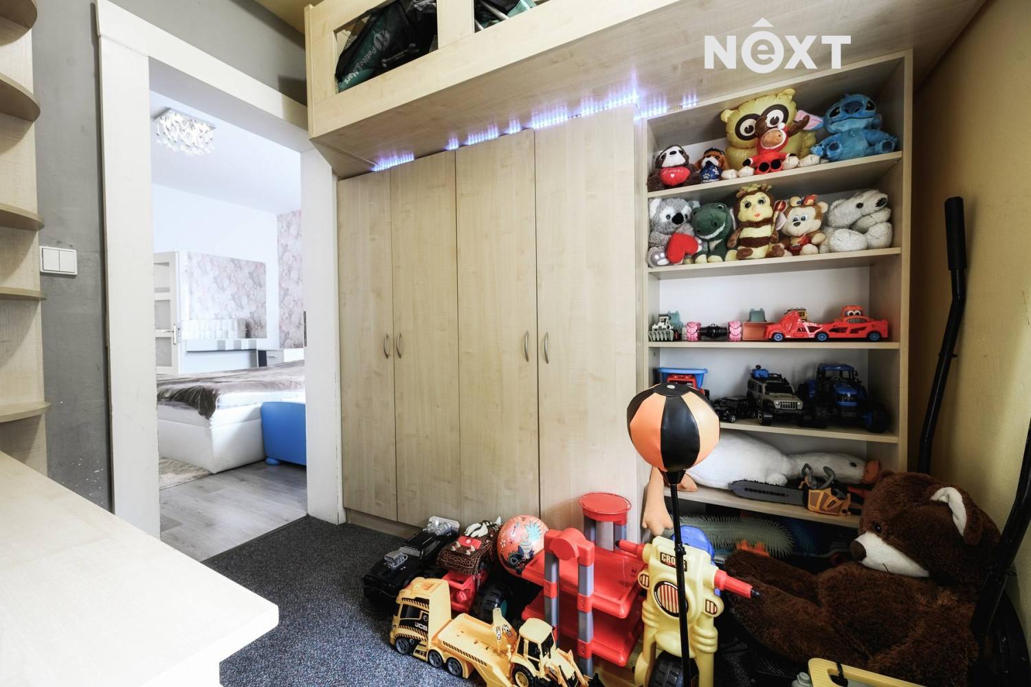 Pokoje: Dvě samostatné ložnice a mezi nimi menší pokoj (pracovna či dětský pokojík). Díky unikátní dispozici jsou místnosti přístupné vždy ze dvou stran, což nabízí variabilitu uspořádání a krásný „okružní“ průchod bytem.