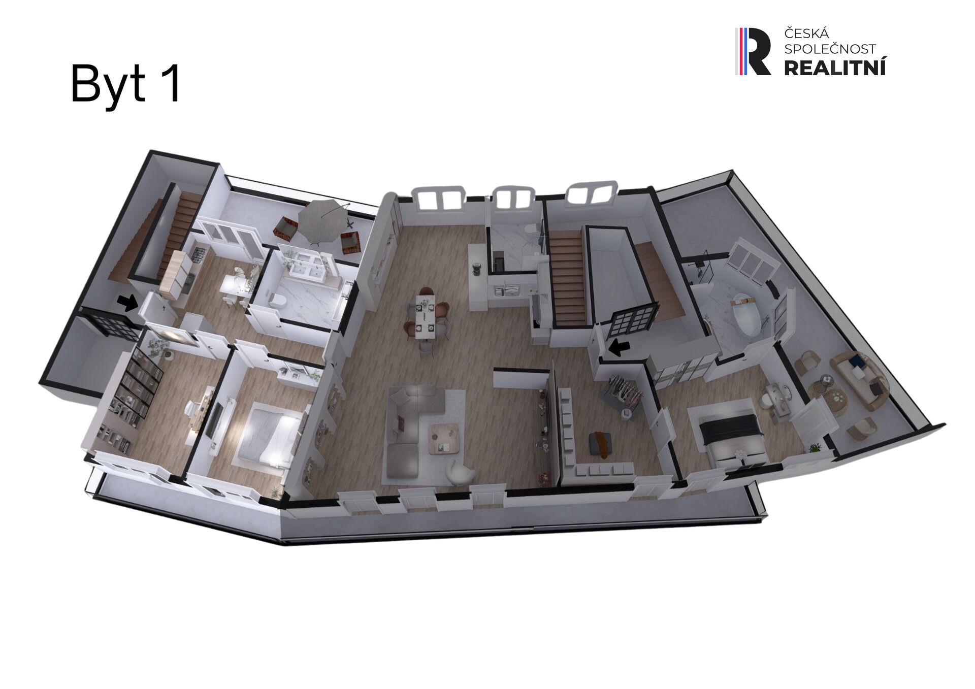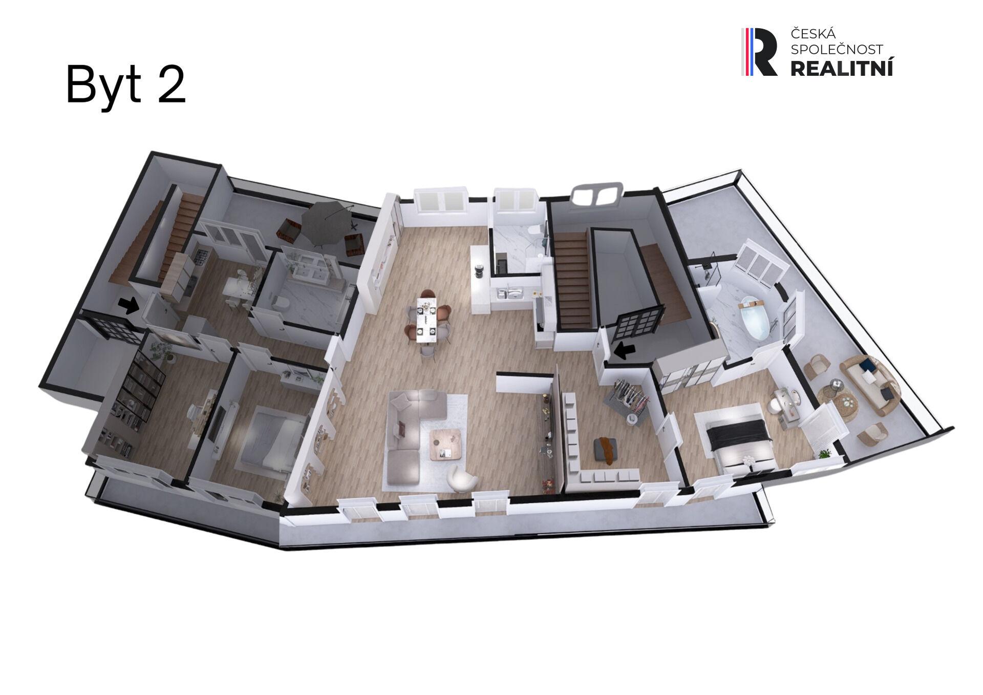• Nadstandardní bydlení pro velkou rodinu – 3 ložnice, 2 kuchyně, 3 koupelny, šatna, rozsáhlé terasy