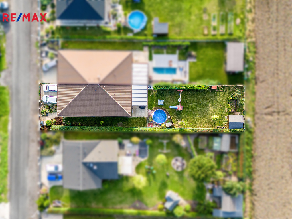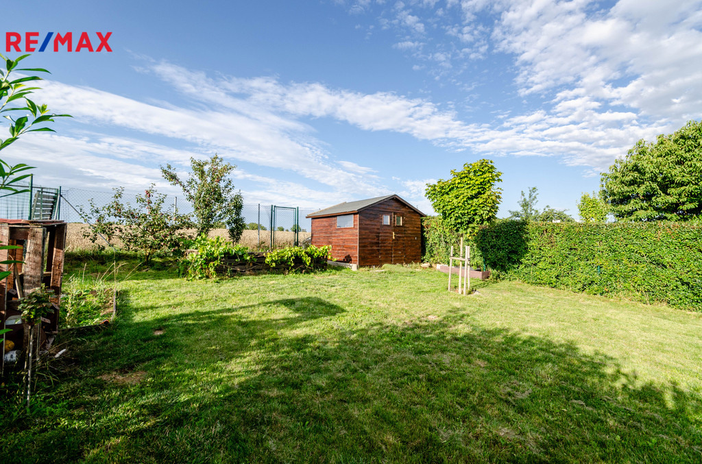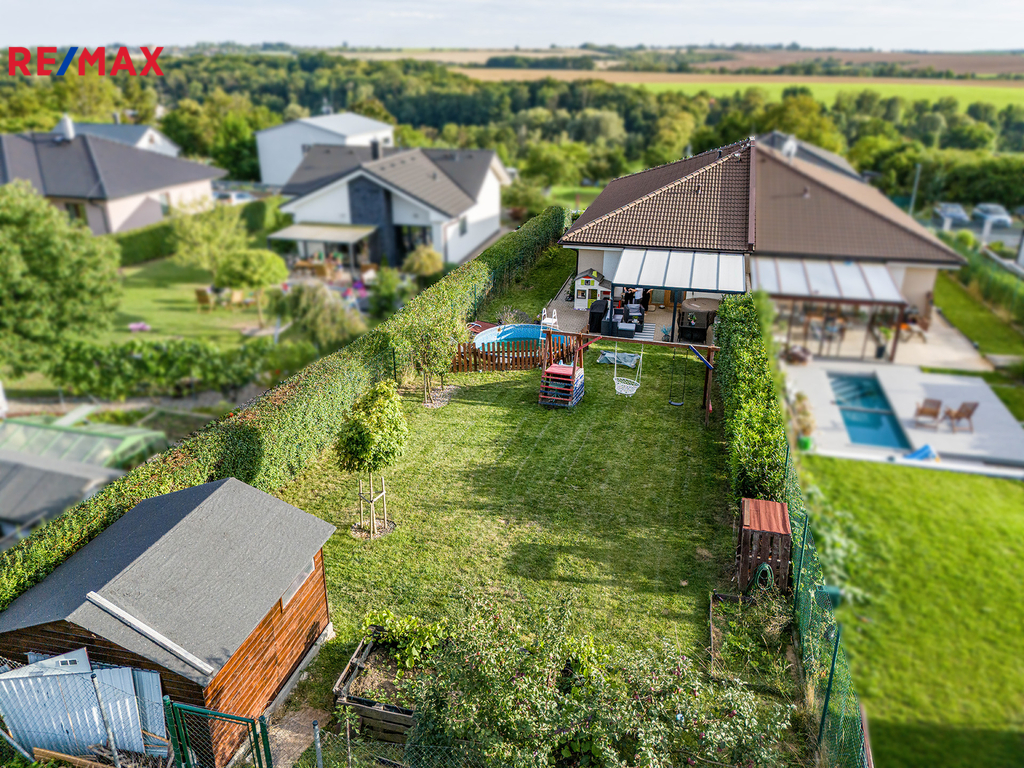 Pozemek o rozloze 556 m² nabízí dostatek prostoru pro dětské hry, relaxaci a rodinné aktivity a zároveň není tak náročný na údržbu zeleně. Na zahradě se nachází příjemný bazén, houpačka a praktický zahradní domek. Pro ještě větší pohodu můžete využít vířivku umístěnou na zastřešené terase, která je skvělým místem pro odpočinek i v případě nepříznivého počasí. Zastřešená terasa dále nabízí prostor pro rodinné grilování a posezení.