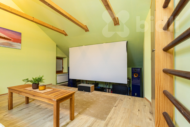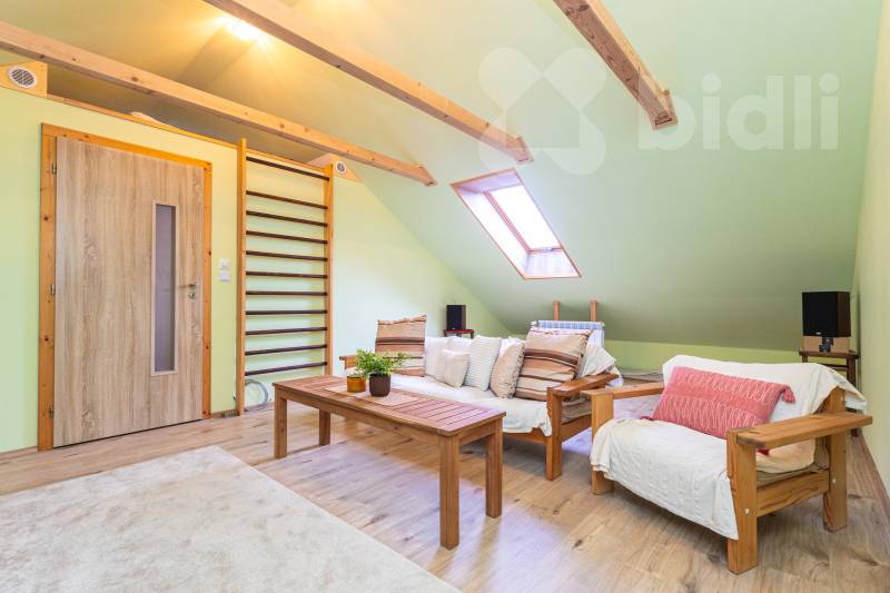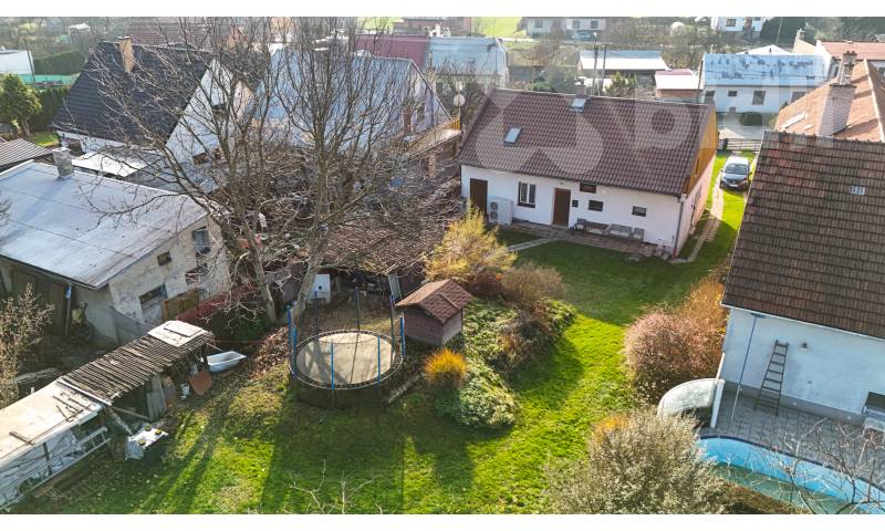 Zahradě v mírně svažitém terénu plné zeleně, ovocných stromů a příjemných zákoutí, dominuje vzrostlá borovice Black, která vytváří jedinečnou atmosféru. Zahrada zároveň nabízí ideální podmínky pro pěstování vlastní zeleniny a ovoce a poskytuje dostatek prostoru i pro dětské hry a volnočasové aktivity.