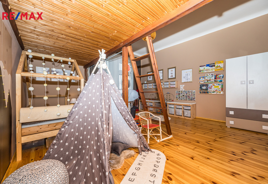 V podkroví jsou vybudovány dva pokoje a k dispozici je také půda, ze které lze jednoduchou úpravou vytvořit další plnohodnotný byt o dispozici 3+1. Dům tak nabízí potenciál dvougeneračního bydlení nebo rozšíření investičních možností.