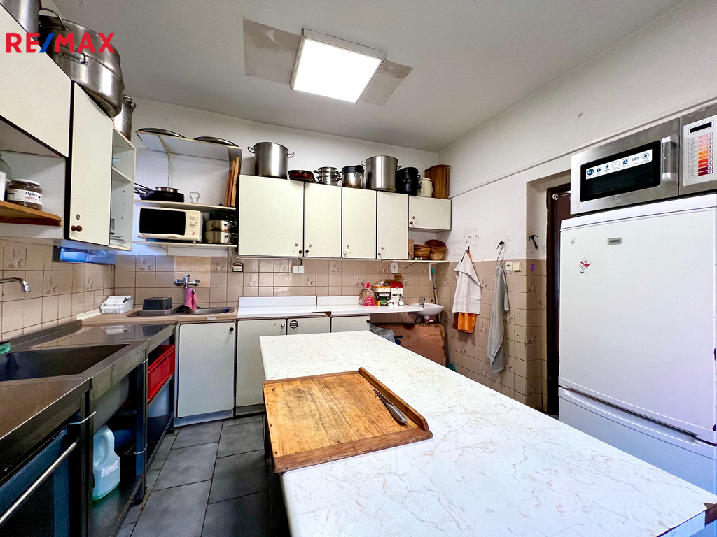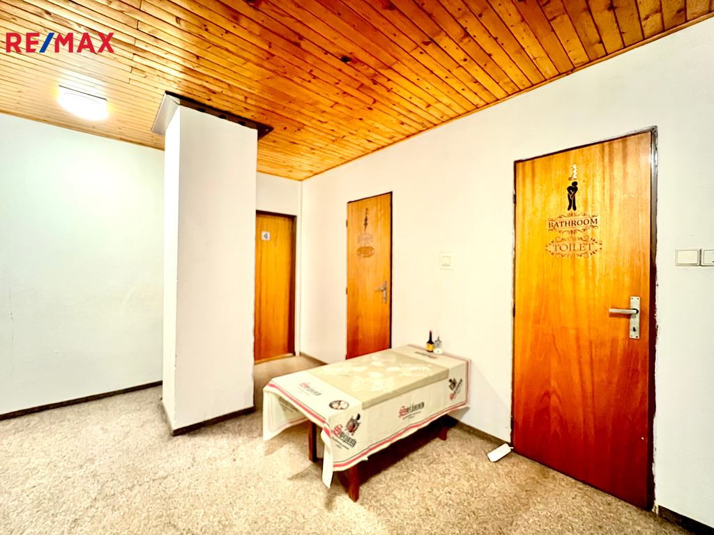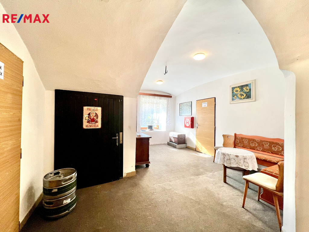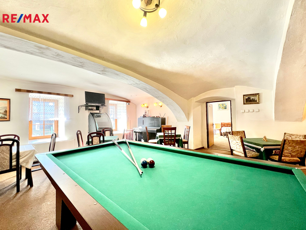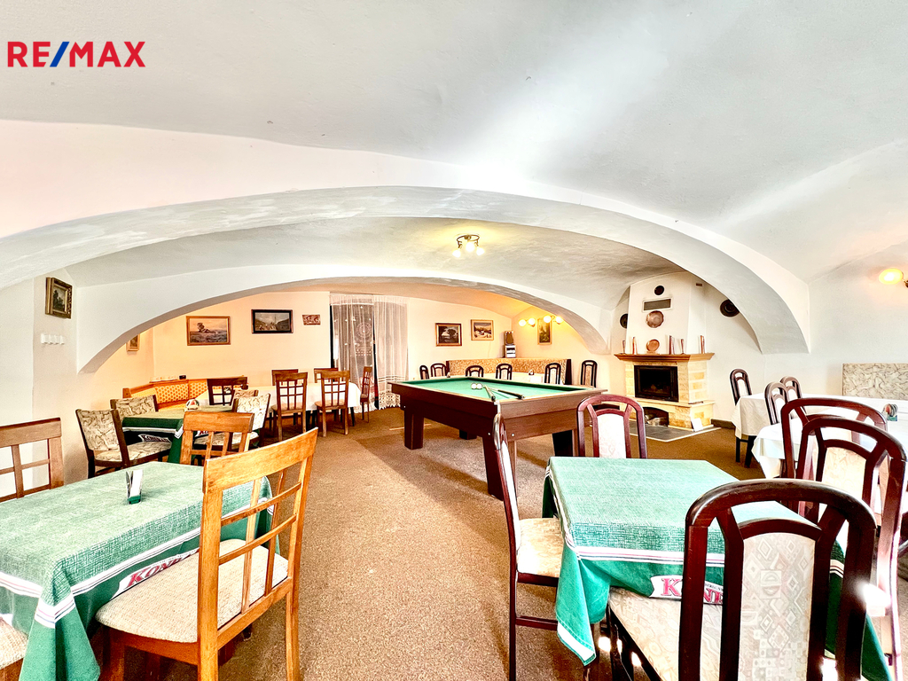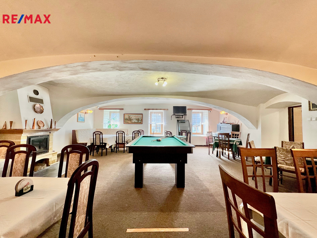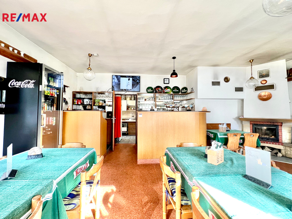 Restaurace s vybavenou kuchyní, 20 míst k sezení, bar, WC. Velký salonek 50 míst, krb, kulečník, šipky - možnost pořádání akcí, svatby, rodinné oslavy atd.