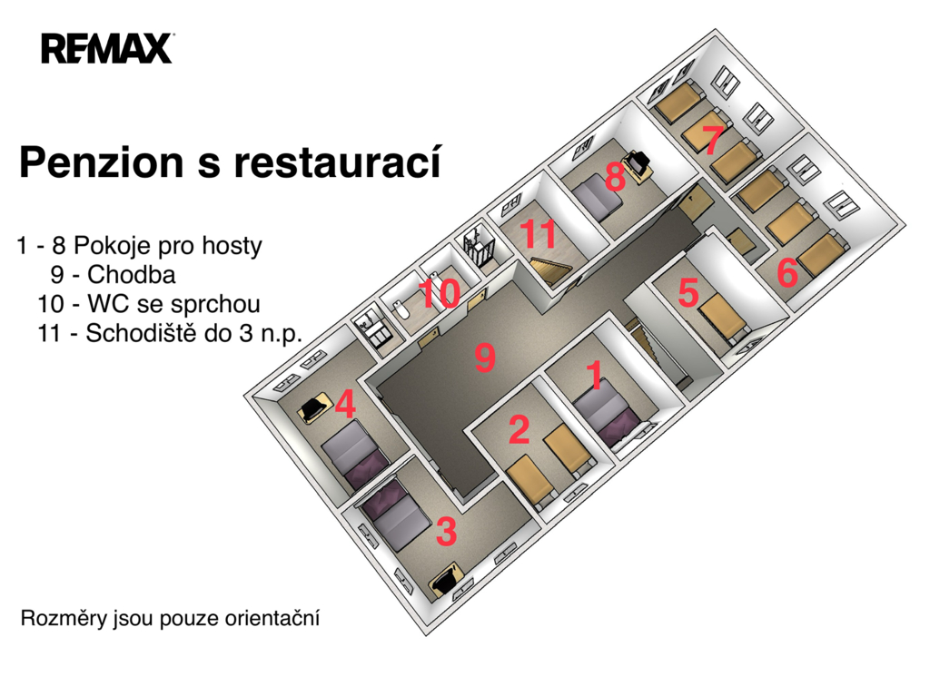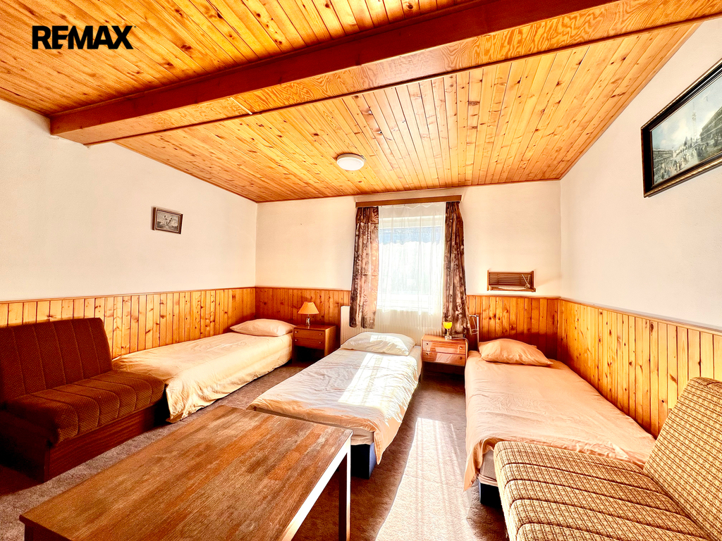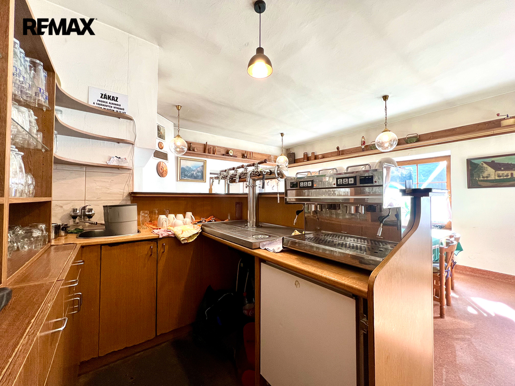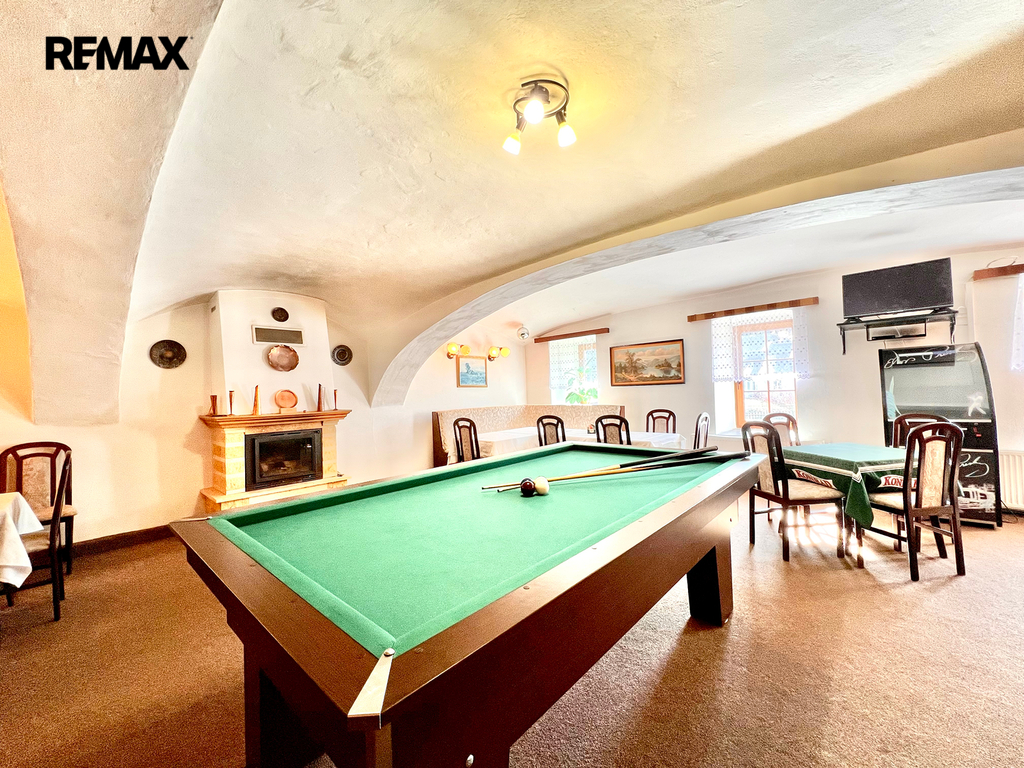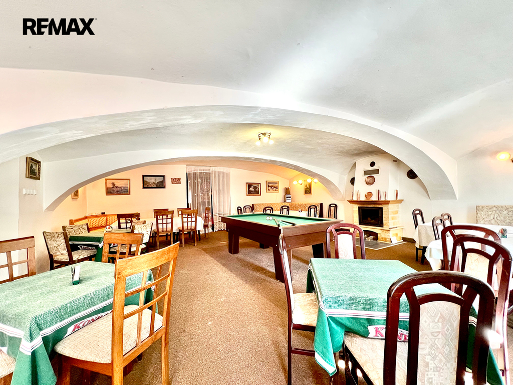restaurace s vybavenou kuchyní (cca 20 míst), velký salonek (cca 50 míst) – ideální pro akce, svatby, oslavy, penzion s kapacitou cca 26 lůžek,