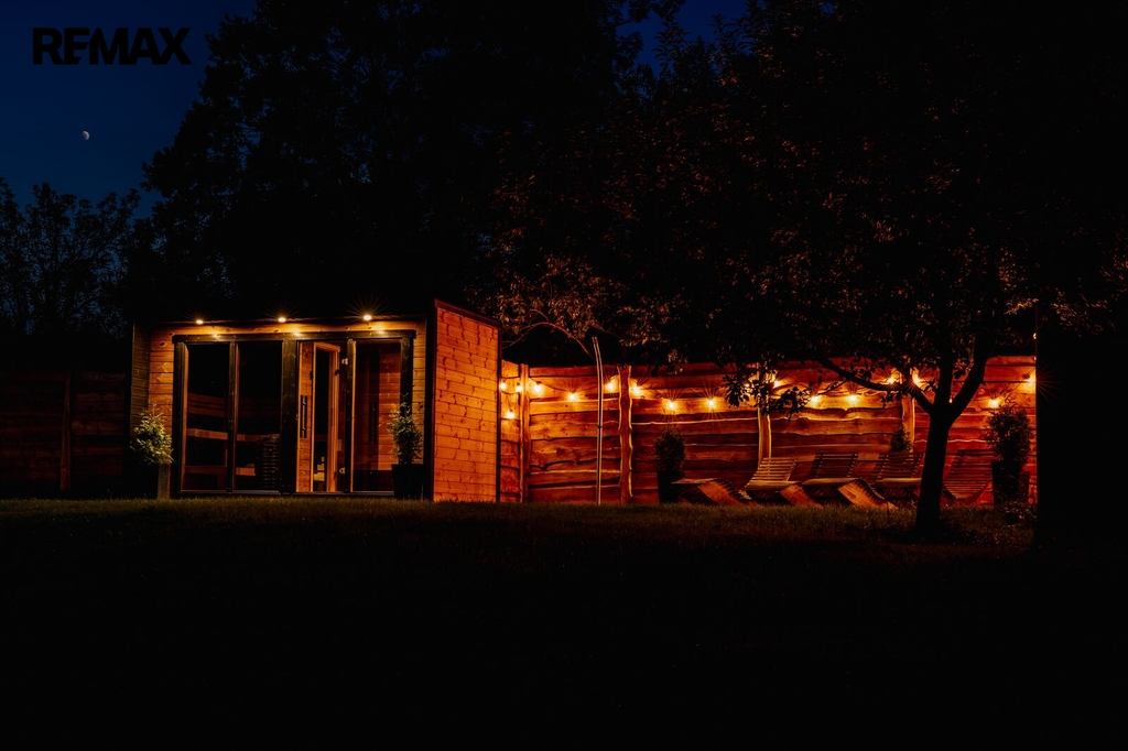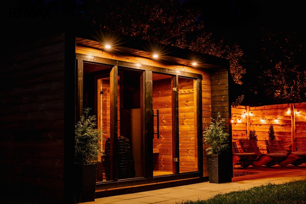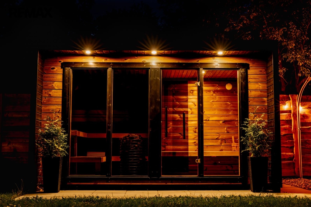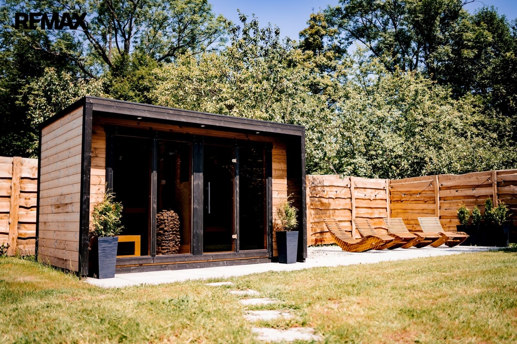 Na pozemku se nachází finská sauna s odpočívárnou. Součástí je zpevněná venkovní zóna s celoročně využitelnou sprchou s dohřevem proti zamrznutí. Dále je na pozemku stylové ohniště s posezením.
