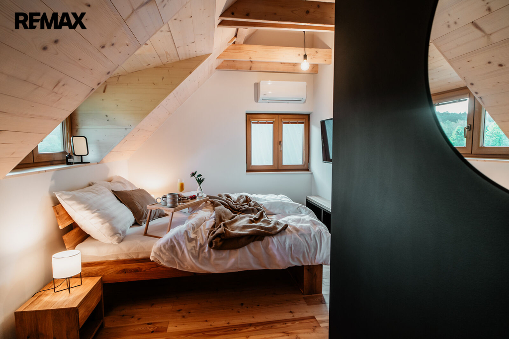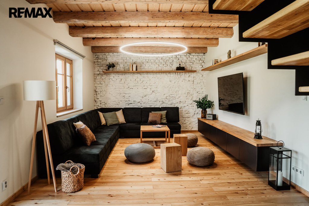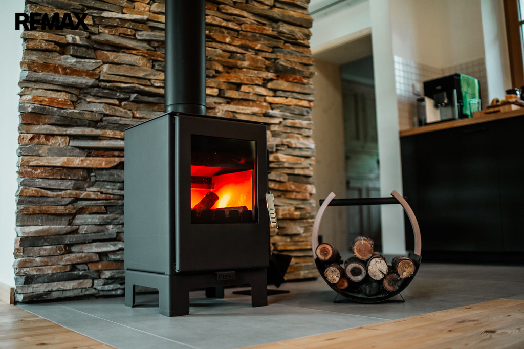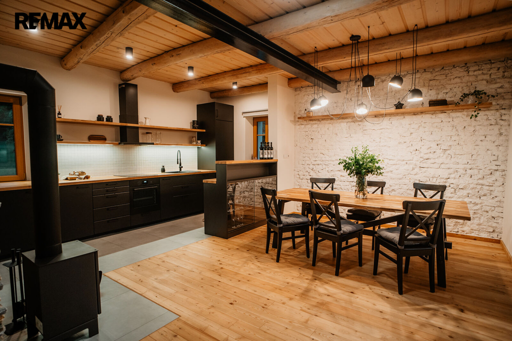 Pro navození pohodové atmosféry, a jako záložní zdroj, vytápění má nemovitost krbová kamna. Velmi pěkně vypadá designové schodiště na míru, které dotváří a podtrhuje celý funkční celek.