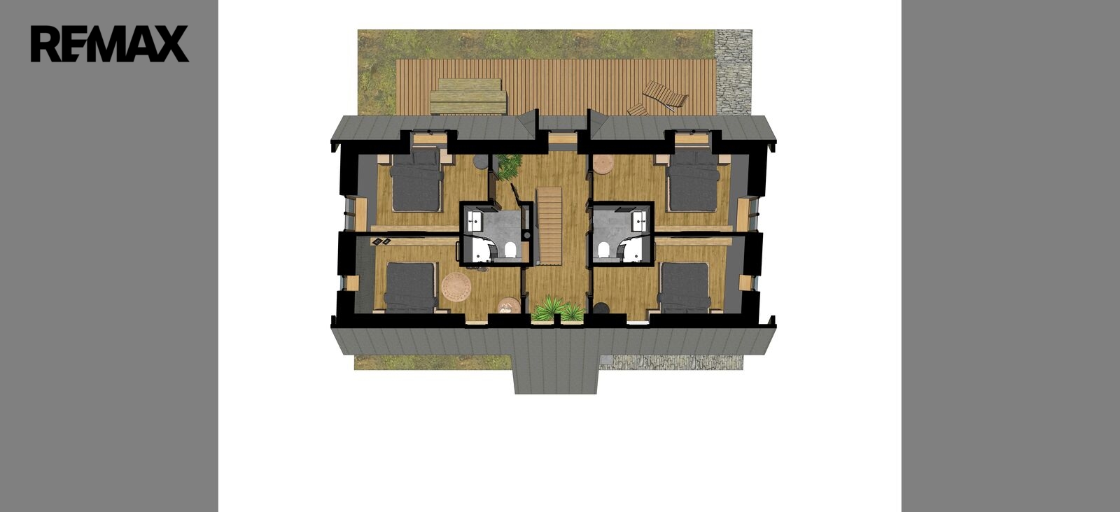 Ve 2. NP jsou 4 samostatné neprůchozí ložnice. Dále 2 koupelny – celkem jsou tedy v domě 3.