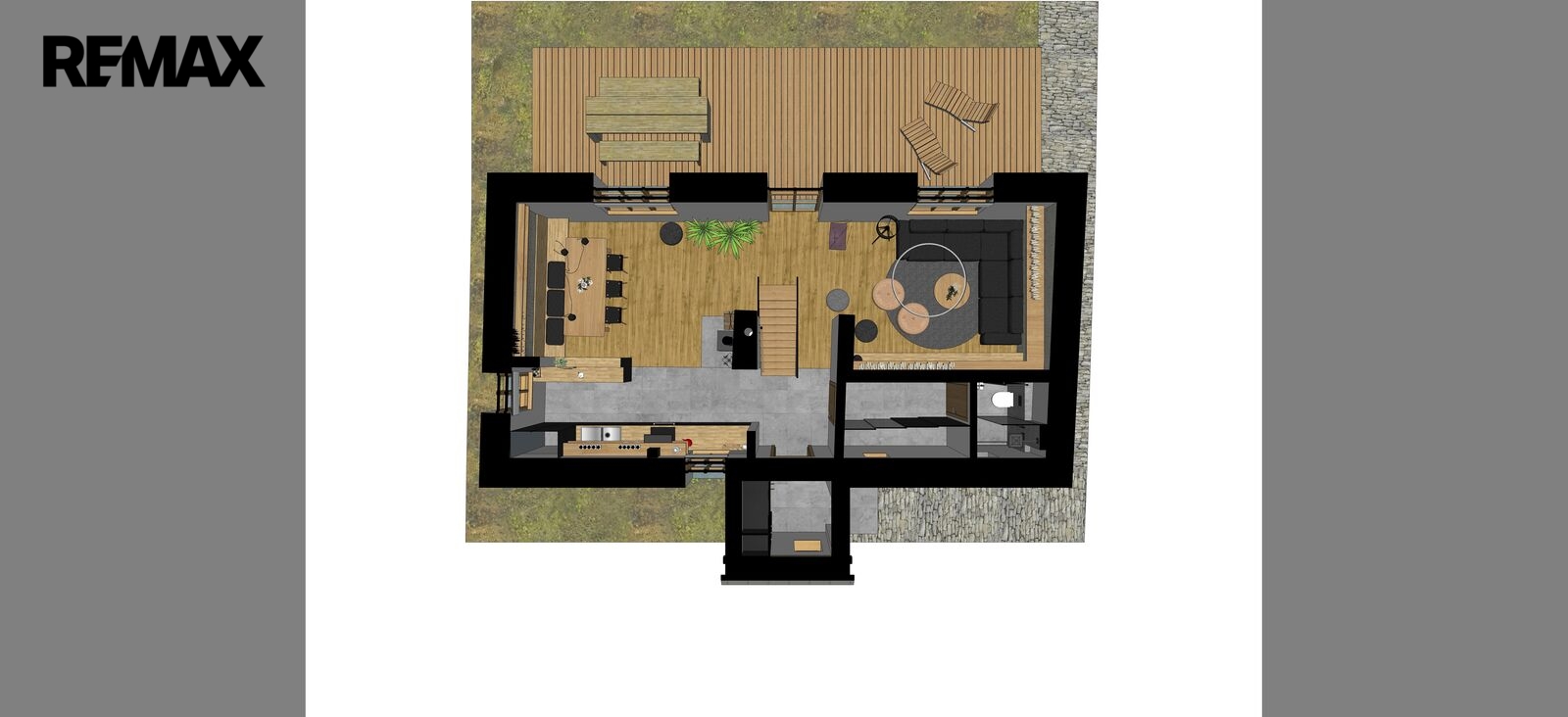 V 1. NP je denní obytná část, s jídelnou s kuchyňským koutem. Kuchyňská linka, se spotřebiči na míru, má desku z masivu. Z masivu jsou rovněž police, dveře, obložky, parapety a samozřejmě podlahy.