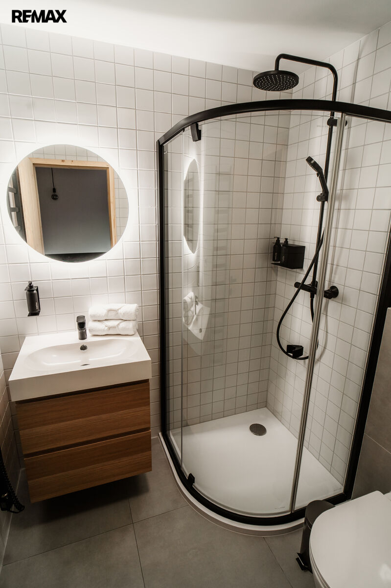 Dále je zde zádveří s úložnými prostory na míru, technická místnost, koupelna se sprchovým koutem a toaletou.