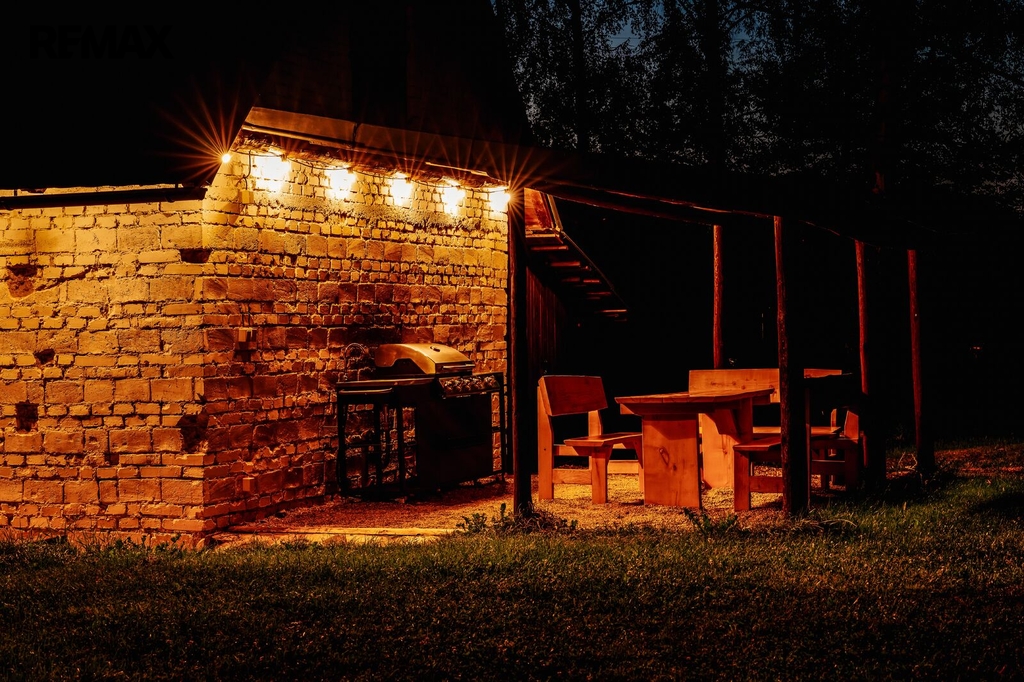 Na pozemku se dále nachází přilehlá budova, která slouží jako sklad, technické zázemí, úložiště kol, lyží, dřeva a garáž pro traktor. Možnost využití půdních prostorů. Součástí je zastřešení, kde je koupací sud s dohřevem proti zamrznutí a krytá pergola s plynovým grilem a posezením.