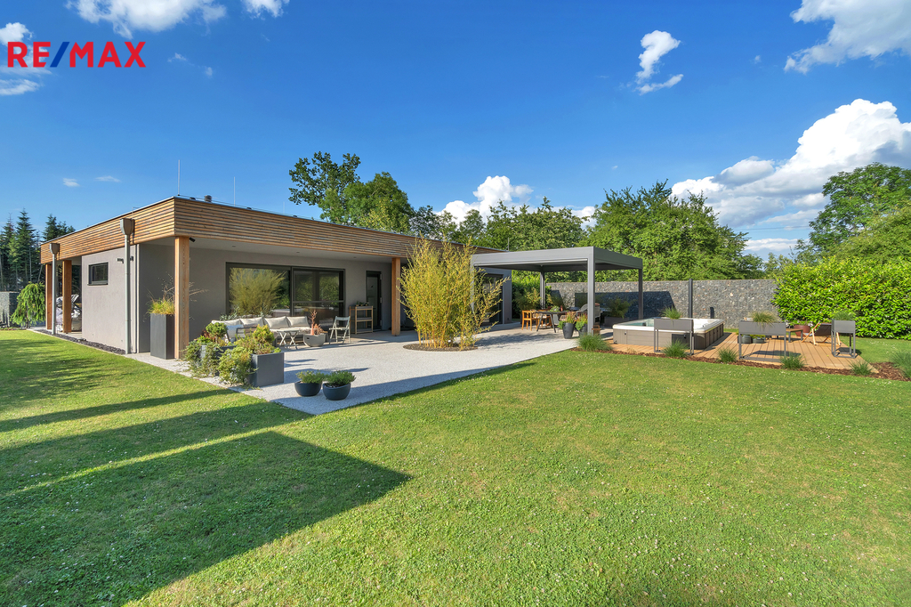 Celková výměra pozemku 1321m2 z toho je 123m2 zastavěno domem a zbývajících 1198m2 náleží k volnému pohybu po pozemku, který je oplocen. Zahrada je zatravněna s kombinací keřů a rostlin jako např. bambus dle zahradního architekta. Venkovní zastřešená pergola na elektrické dálkové ovládání umožnuje komfortní relaxaci v deštivých i parných dnech.