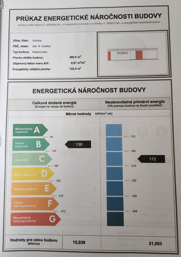 - Ukazatel energetické náročnosti budovy: 130 kWh/m²
