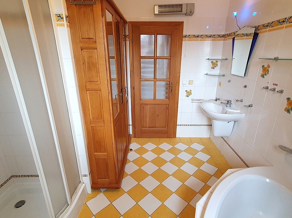 Prostorný dům stojí na velkorysém pozemku 1150 m2. Je samostatný, dvoupodlažní, o dispozici 6+kk, velikosti 252 m2 + terasa + garáž 33 m2. Nachází se v klidné části obce Kunice - Vidovice, okres Praha - Východ, v ulici Járy Cimrmana. Součástí pozemku je krásná, udržovaná zahrada o velikosti 955 m2. Orientace domu je na slunný západ - 5 pokojů, terasa je na jih, kuchyně, spíž a koupelny jsou na sever a 1 ložnice je na východ. V přízemí domu se nachází vstupní chodba, obývací pokoj s jídelnou, kuchyně, prostorná spíž, 3 neprůchozí ložnice, hlavní koupelna s umývadlem, rohovou vanou i sprchovým koutem a samostatné WC. V patře jsou 2 velké samostatné pokoje - jeden se vstupem do vlastní samostatné šatny a do vlastní koupelny (vana, umývadlo, WC, pisoár) a druhý prostorný pokoj se vstupem do samostatné šatny.