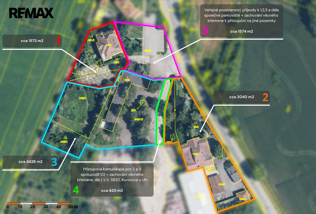 Nabízíme Vám tedy koupi nemovitosti jako celek, tzn. všechny budovy a pozemky o celkové evidované výměře 11 035 m². Anebo přicházíme s pracovním návrhem na dělení a vytvoření třech funkčních celků pracovně označených 1, 2, 3 se zajištěním přístupových cest a parkování na plochách pracovně označených 4 a 5. Budoucí využití stávajících budov a pozemků záleží již na budoucích nových vlastnicích buďto s možností koupě celku a nebo, dle jednotlivě navržených ploch 1, 2, 3 se spolupodílem na plochách 4 a 5.