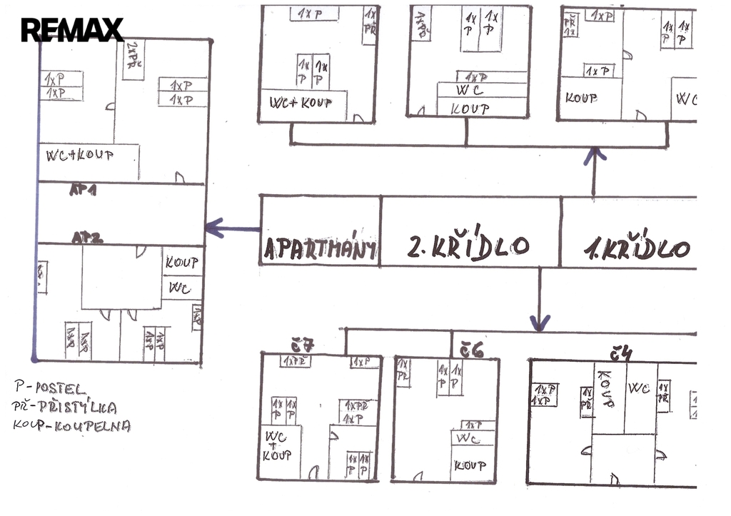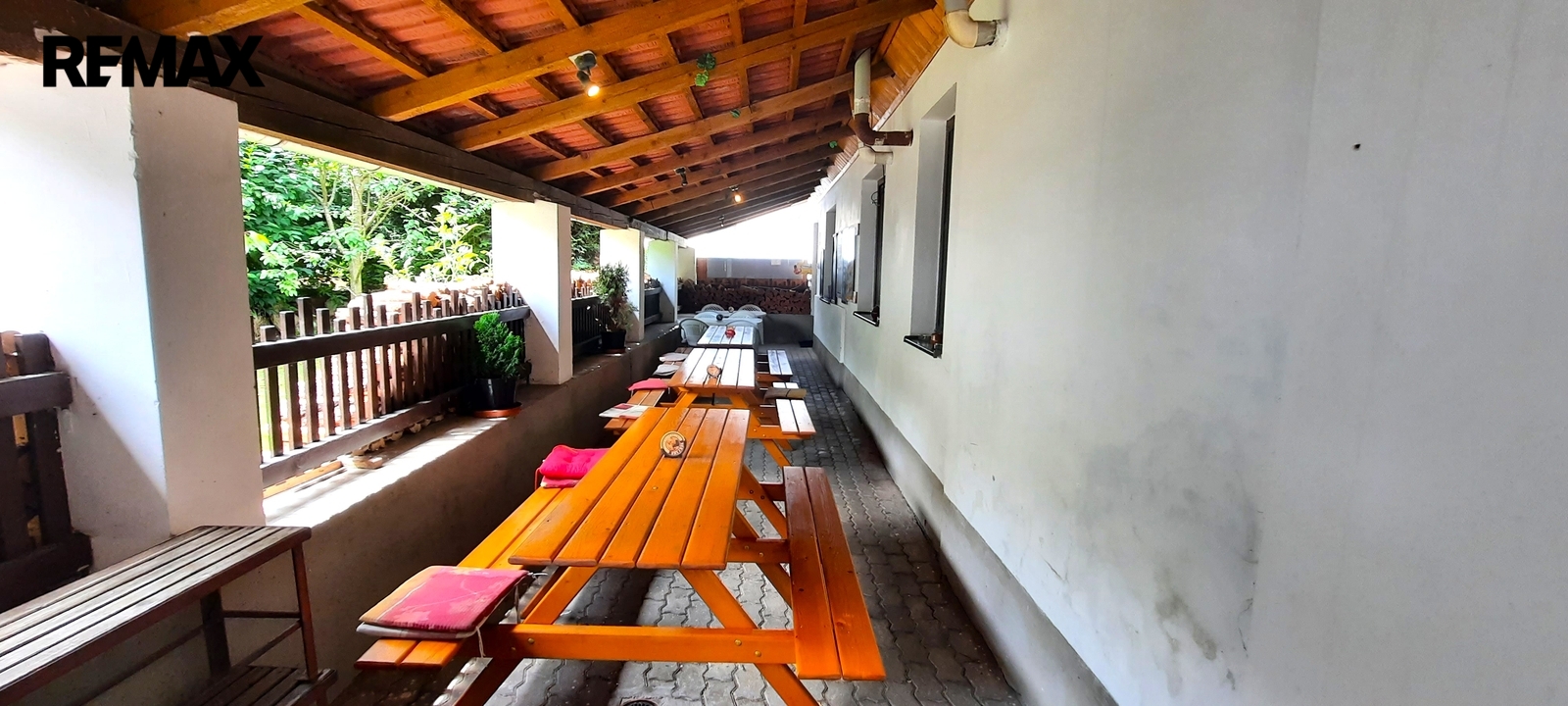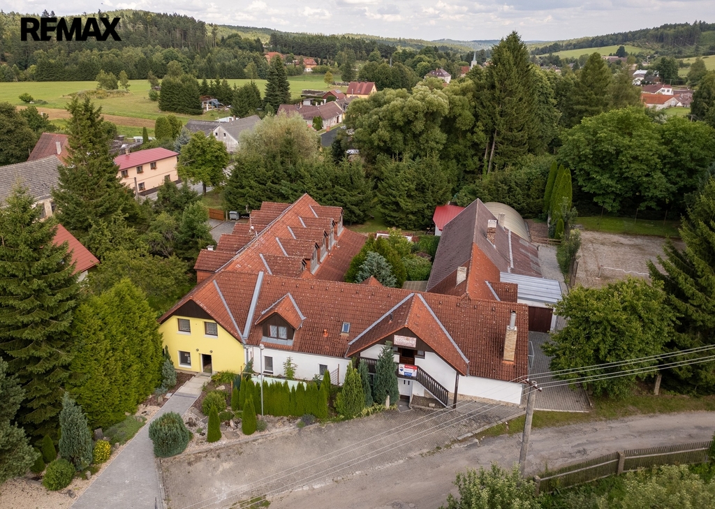 Dům o velikosti 300 m2 byl vybudován před 20 lety z asi 100 let starého zemědělského objektu. Zastavěná plocha činí cca 680 m2 a celková výměra parcely je 3811 m2. V současné době je nemovitost využívána jako penzion a nabízí k dispozici 8 pokojů a 2 apartmány. Každý pokoj disponuje vlastní koupelnou a WC. Každé křídlo (3 pokoje) má k dispozici společnou kuchyňku. Každý z apartmánů disponuje vlastní kompletně vybavenou prostornou kuchyní. Dále se zde nachází společenská místnost s vlastní kuchyňskou linkou. V přízemí penzionu se nachází restaurace s kapacitou 40 míst a prostornou kuchyní. Dále možno využít posezení na venkovní terase o velikosti cca 30 míst. Přímo u domu se nachází zastřešený bazén, víceúčelové sportovní hřiště, dětské hřiště s houpačkami a skluzavkou a venkovní posezení s grilem. Parkování možno na vlastním parkovišti před domem nebo přímo v areálu.