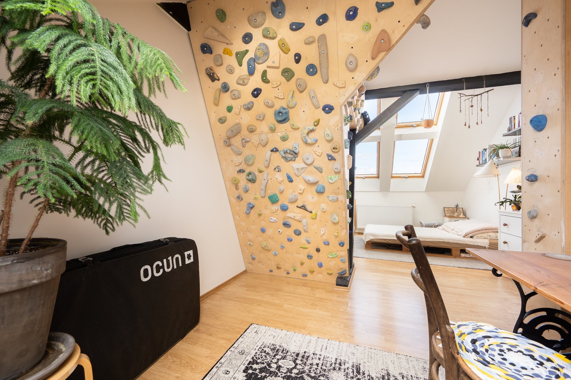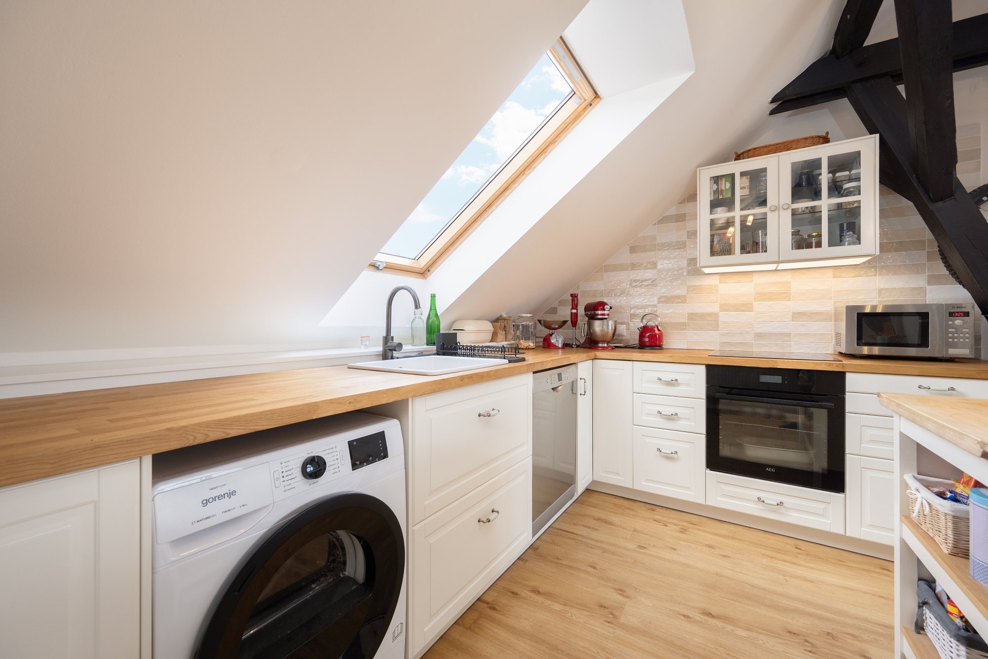 Hlavními designovými prvky v interiéru jsou krásné dřevěné nosné trámy. Vstupní chodba bytu je ozvláštněna krátkým schodištěm. Celý prostor je chodby působí velmi vzdušně a světle. V bytě je spousta úložných prostor a vestavěných skříní.