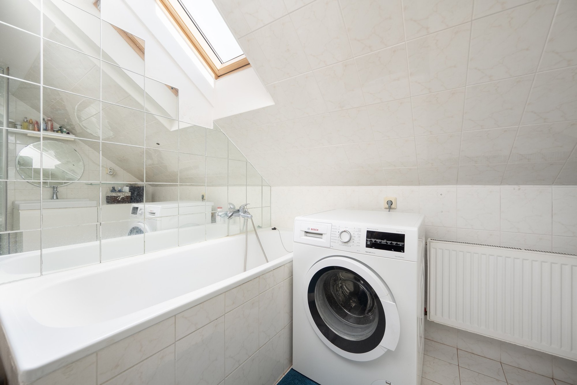 V chodbě je prostorná koupelna s vanou a sprchovým koutem, je zde i místo na pračku. Toaleta je samostatná.