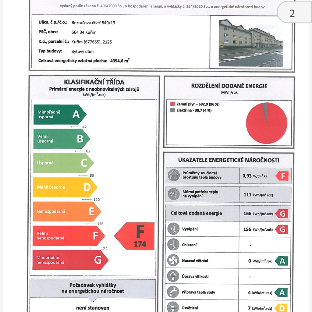 - Ukazatel energetické náročnosti budovy: 174 kWh/m²