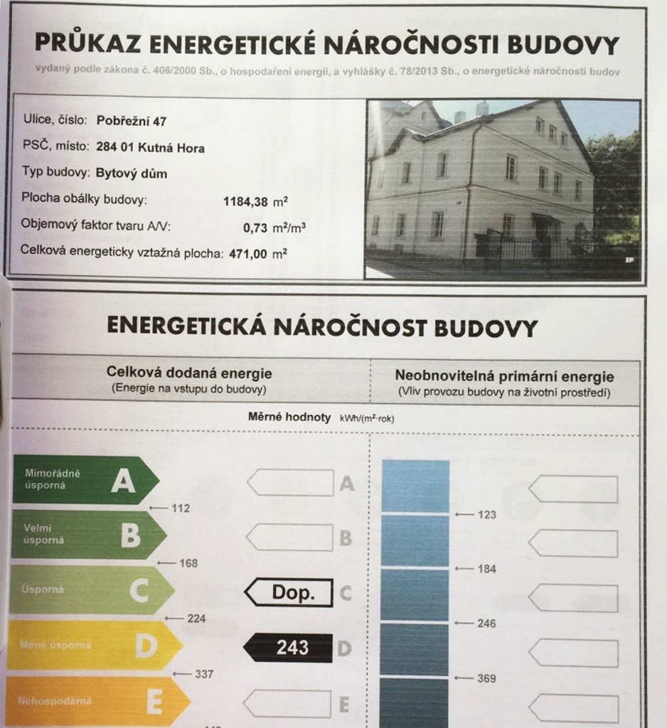 - Ukazatel energetické náročnosti budovy: 243 kWh/m²