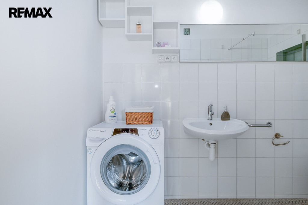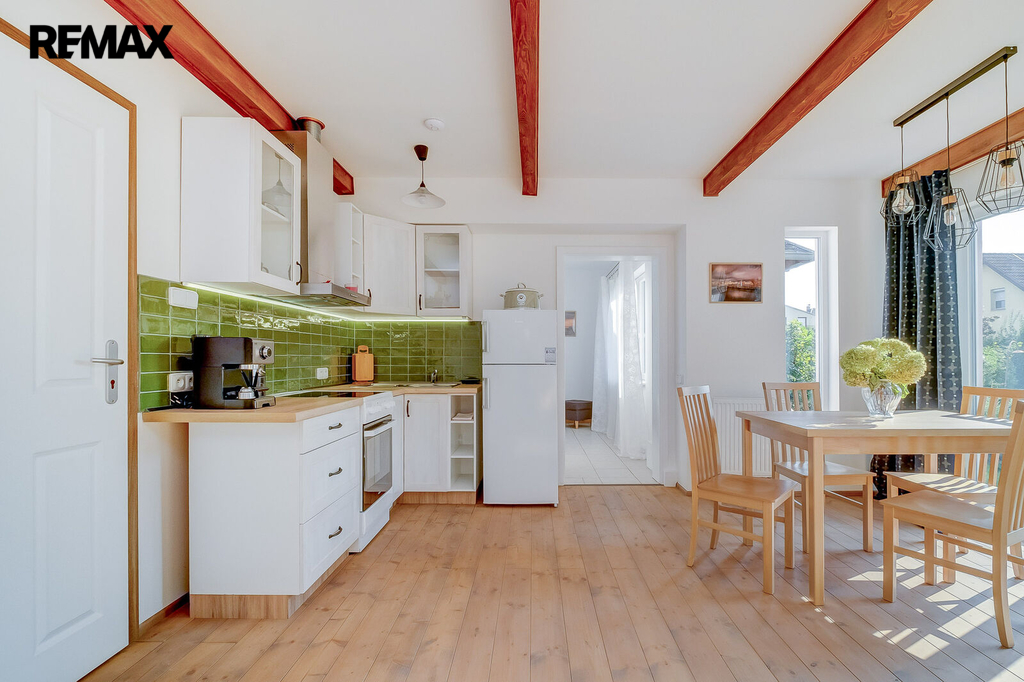 Kuchyňská linka je vybavena elektrickou troubou se sporákem, ledničkou, mrazákem, kávovarem a digestoří. S kuchyní je spojený obývací pokoj s jídelním stolem a malou sedačkou. Byt disponuje skvělou dispozicí, která nabídne prostornou ložnici s postelí, matrací, šatní skříní a velkým francouzským oknem do zahrady. Francouzským oknem se můžete také dostat z obývacího pokoje na zahradu. Zahrada je společná s majiteli domu a po dohodě je možné ji využívat. V koupelně je sprchový kout, toaleta a pračka.