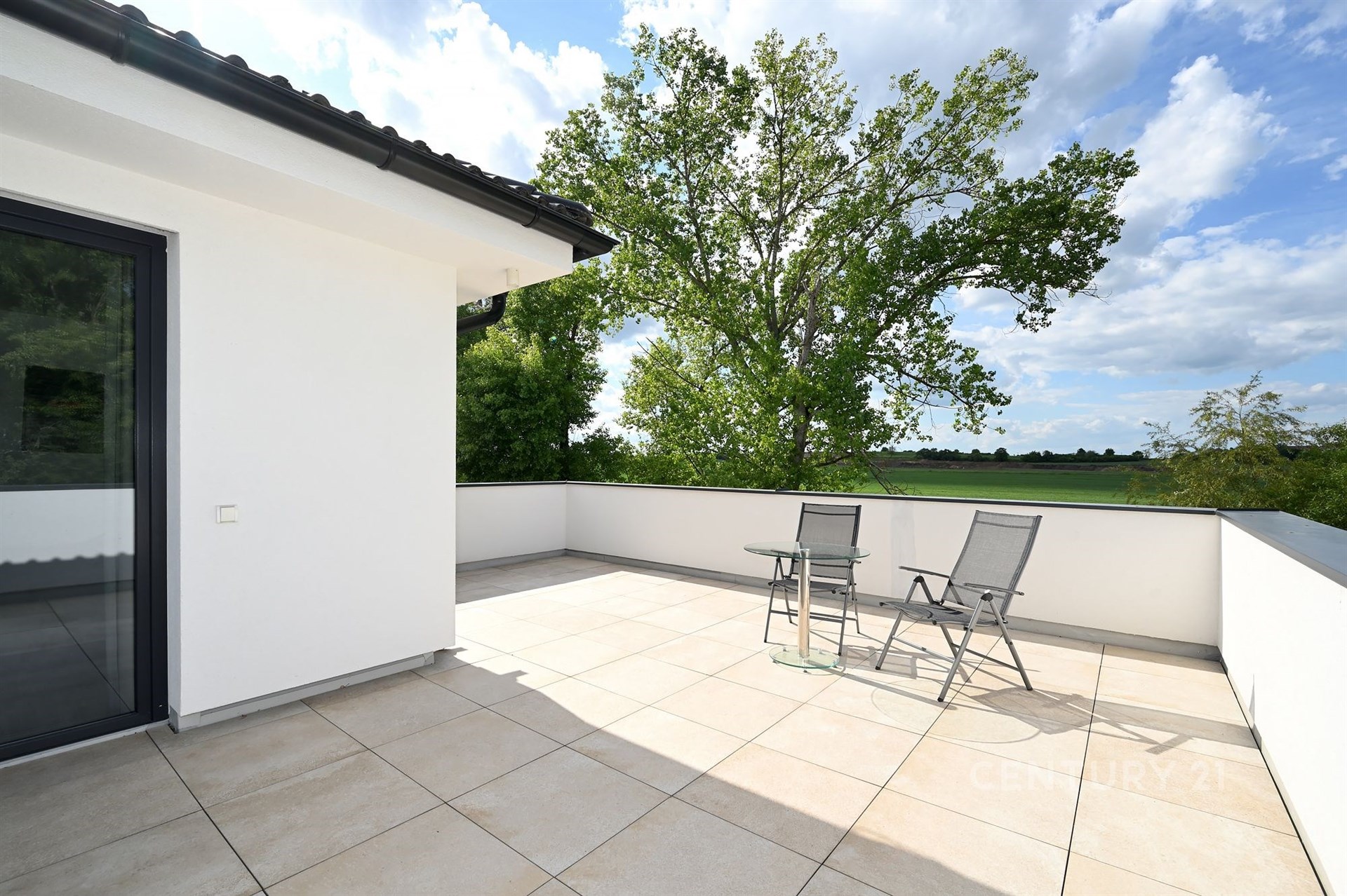 V patře je hlavní ložnice s vlastní terasou a šatnou, dvě další ložnice, dvě koupelny s WC (jedna s vanou a sprchou, druhá se sprchovým koutem), samostatné WC a jeden bidet.