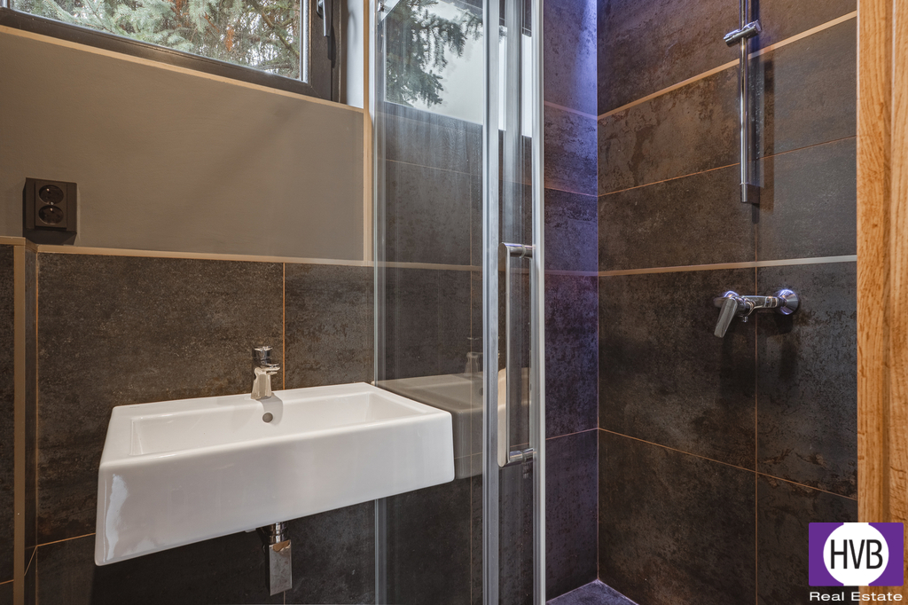V patře je hlavní ložnice, dva další samostatné pokoje vhodné jako dětské pokoje či pracovna a druhá koupelna s vanou, sprchovým koutem a WC.