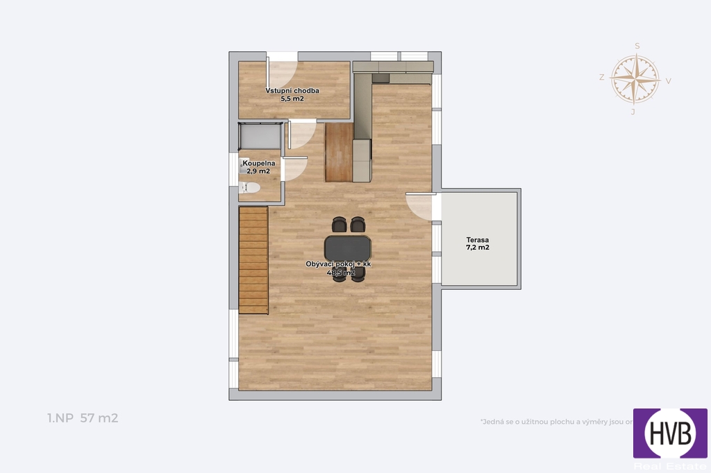 V přízemí se nachází prostorný a světlý obývací pokoj s přímým vstupem na terasu a zahradu, plně vybavený kuchyňský kout (varná deska, digestoř, myčka, lednice), koupelna se sprchovým koutem a WC, technická místnost a praktické úložné prostory.