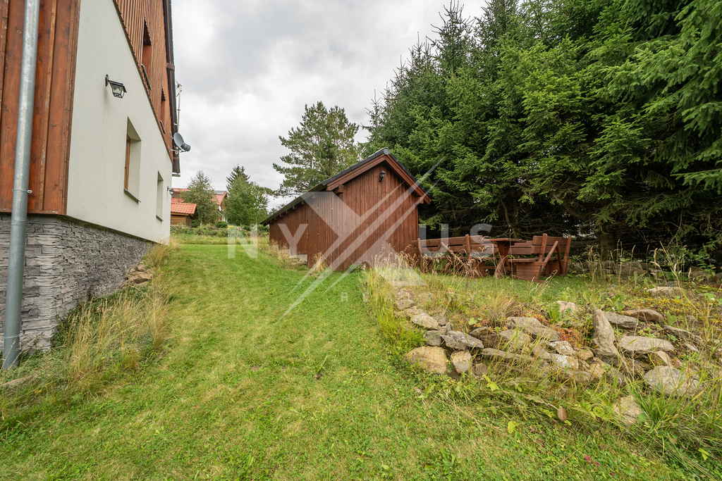 Třípodlažní dům je koncipován tak, aby nabízel jak soukromí, tak i možnost ubytování hostů. V přízemí se nachází prostorný byt o výměře 105 m² s obývacím pokojem, kachlovými kamny, jídelnou a kuchyní. V patře jsou dva útulné apartmány, každý s vlastní kuchyňkou a koupelnou. V suterénu je pak další samostatná jednotka s koupelnou. K dispozici je také sauna, zahradní domek a praktické úložné prostory. Dispozice domu zároveň nabízí zajímavý investiční potenciál – při případných úpravách může objekt umožnit rozdělení až na tři samostatné apartmány a ateliér, což otevírá možnosti jak pro vícegenerační bydlení, tak pro kombinaci vlastního užívání a pronájmu.