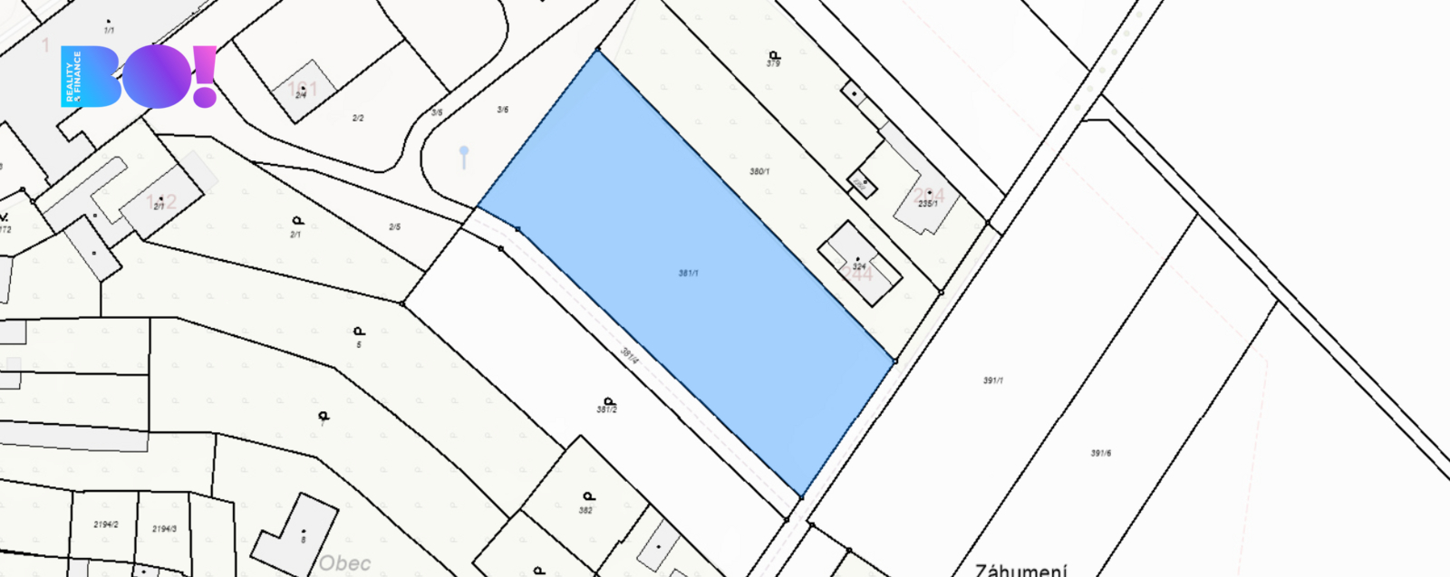 Pozemek má celkovou výměru 4329 m² a nachází se v klidné části obce. Vedle pozemku je z jedné strany postaven rodinný dům a ze strany druhé další stavební parcela o velikosti 2120 m². Pozemek o velikosti cca 43 x 100 m je v územním plánu veden jako BI, tedy bydlení individuální v rodinných domech, které je určené pro výstavbu rodinných domů. Na hranici pozemku se nachází elektřina, vodovod, plyn a kanalizace.