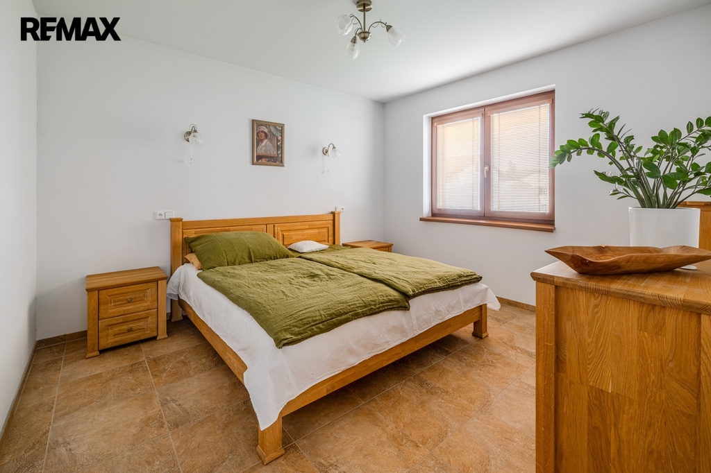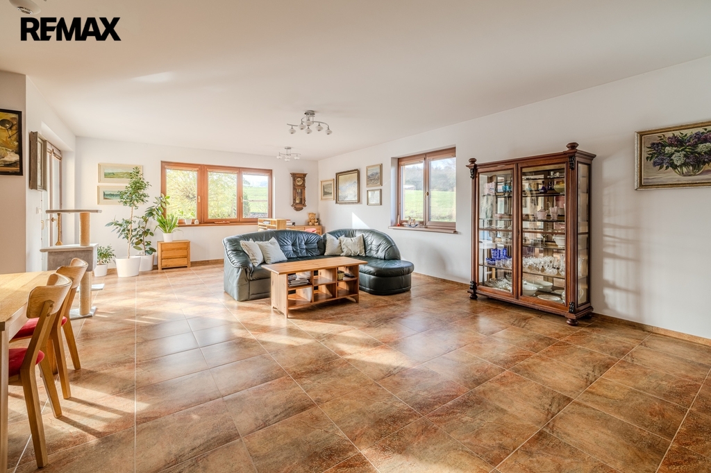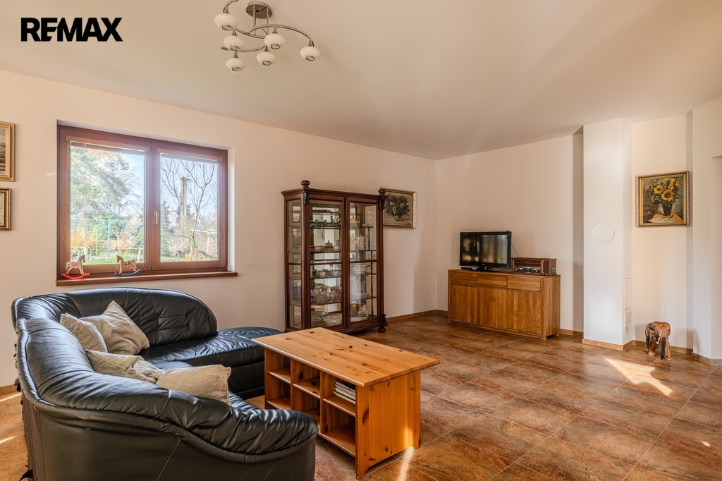 Světlý a útulný prostor s francouzským oknem přímo na žulovou terasu a k vyhřívanému bazénu.
