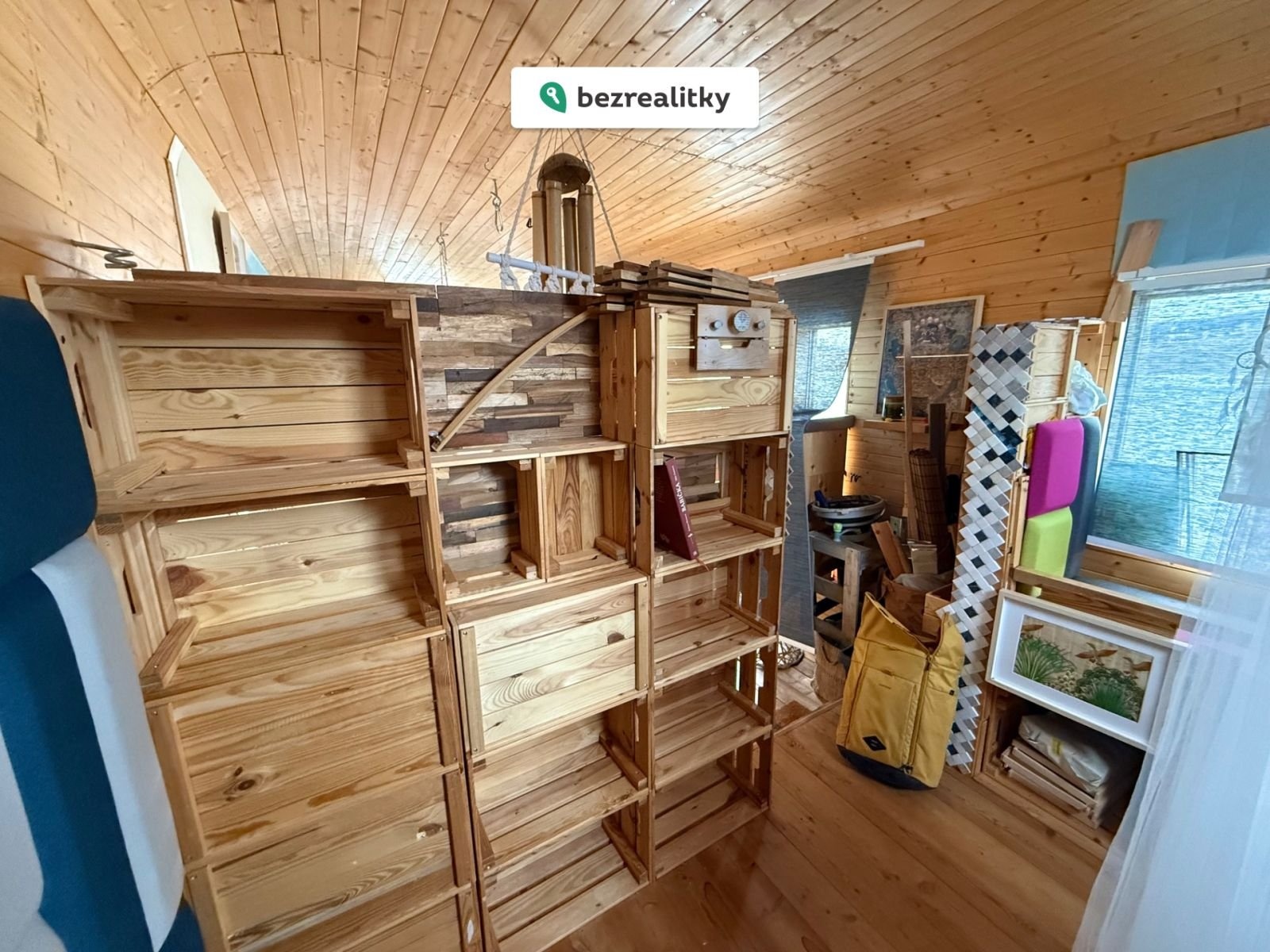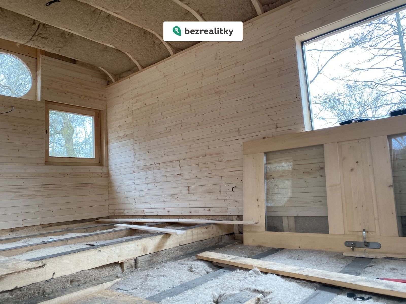 • tři velká okna zajišťující vynikající světlo a výhled do krajiny včetně ještě většího pocitu prostoru. Dále jsou v objektu 4 dřevěná okna se 2 variantami otevření) + 2 kruhová okna dodávající domečku unikátní vzhled a malé okénko v koupelně.