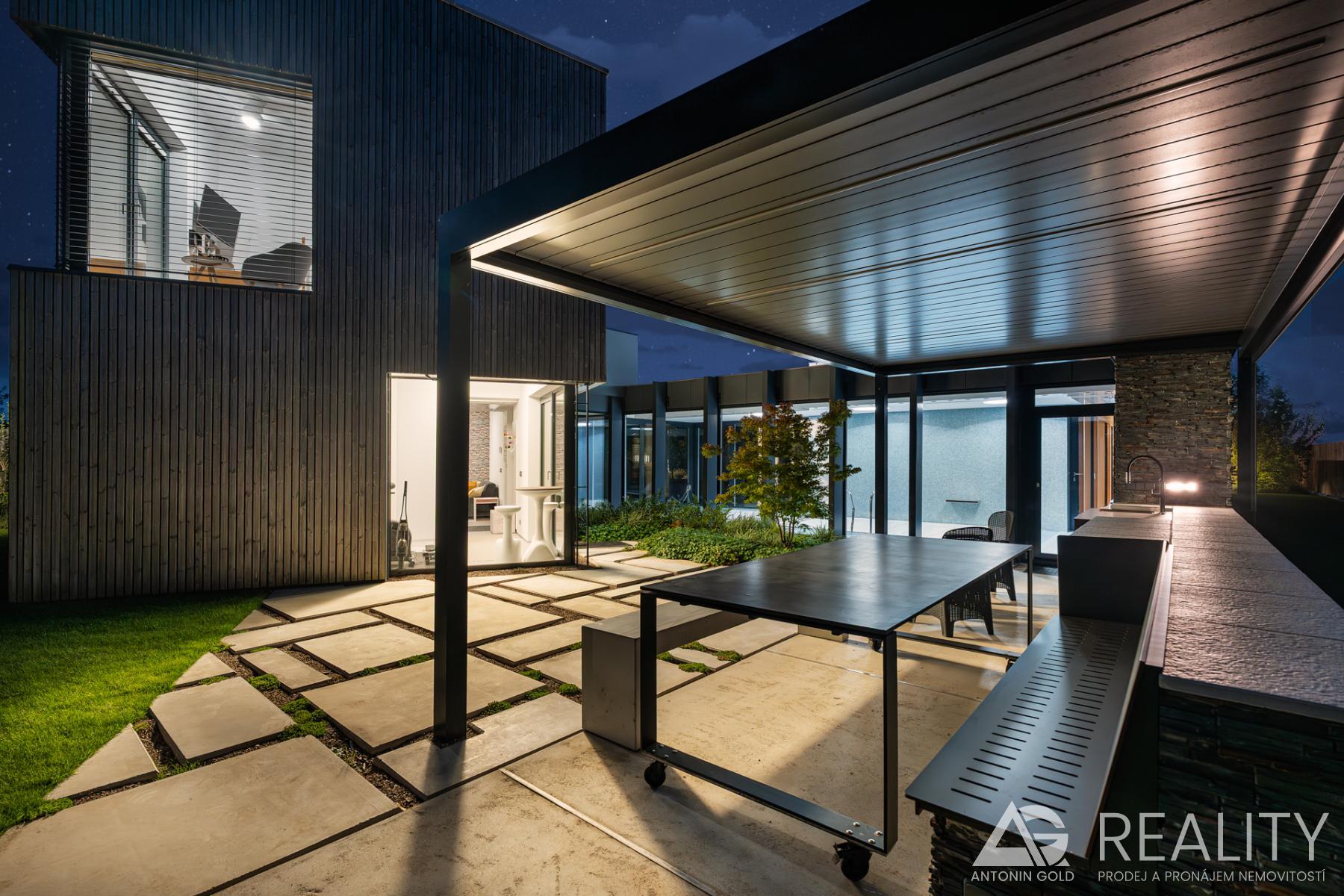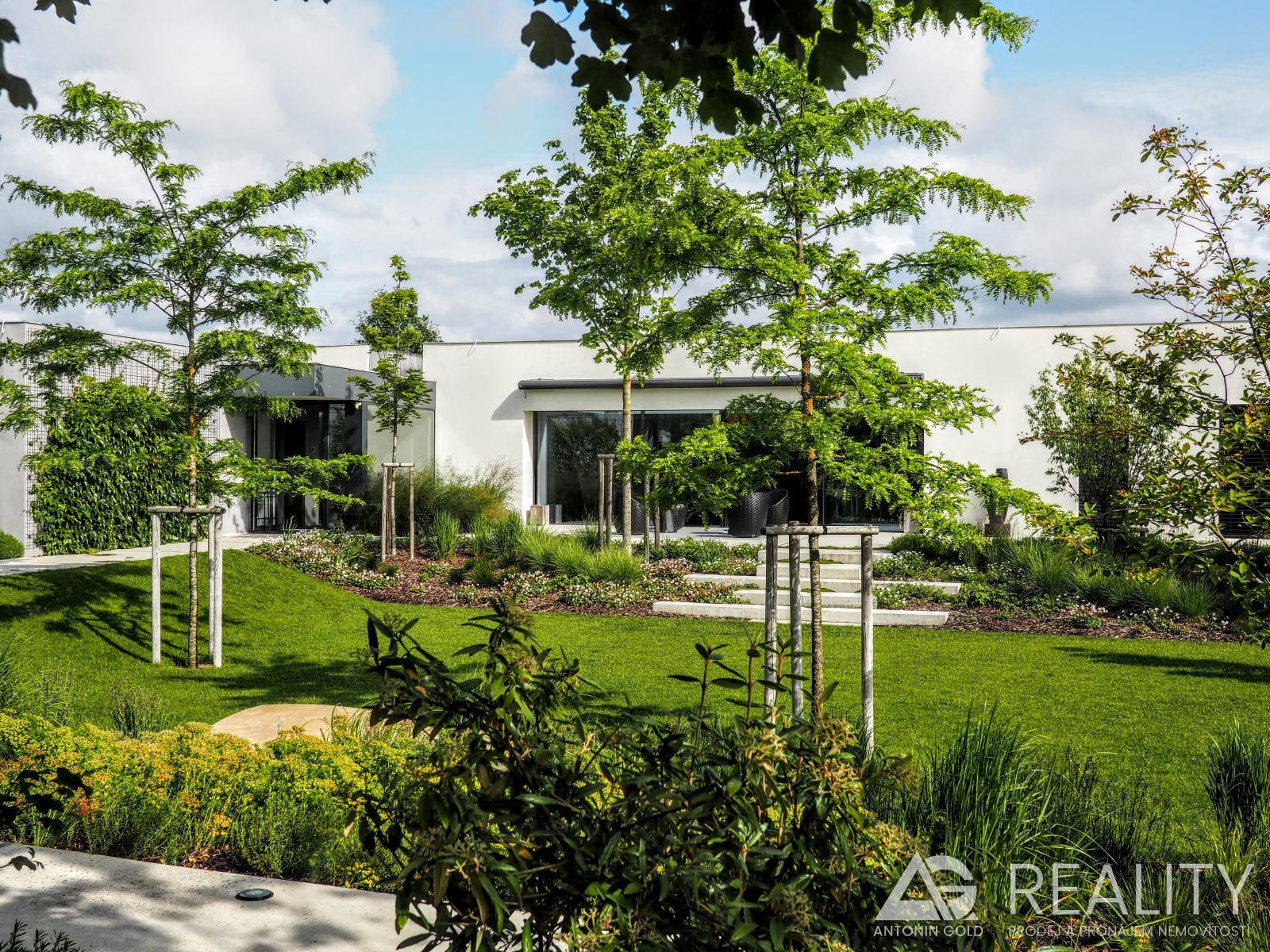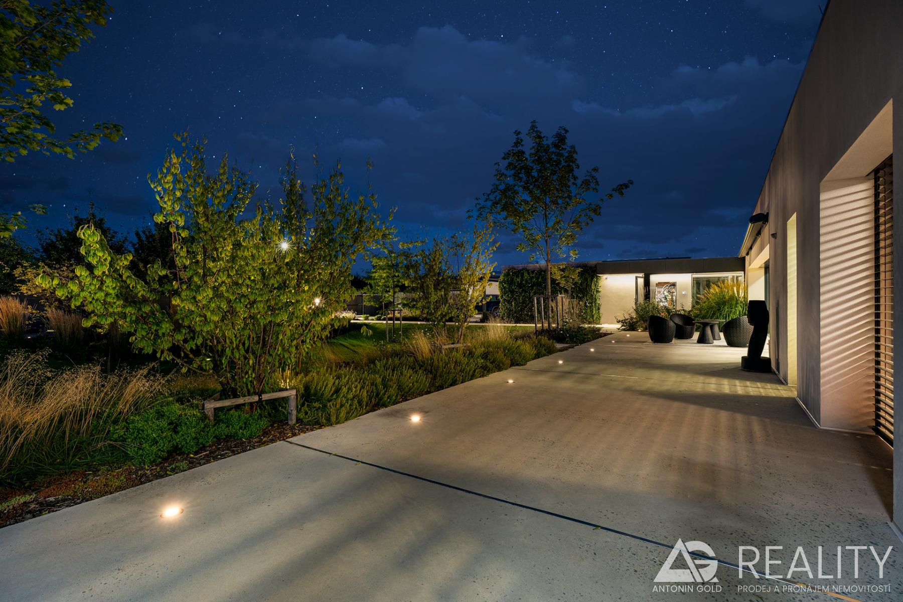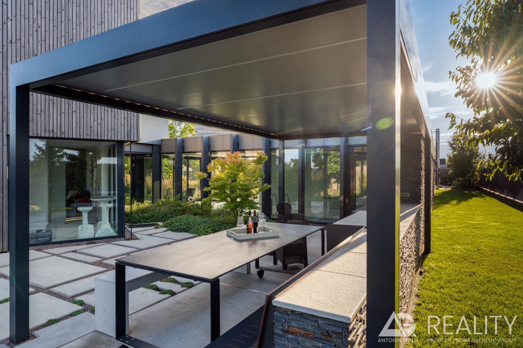 Součástí komplexu je také prostorná dvougaráž a zastřešené parkování pro další vozy, které podtrhují eleganci celého projektu.