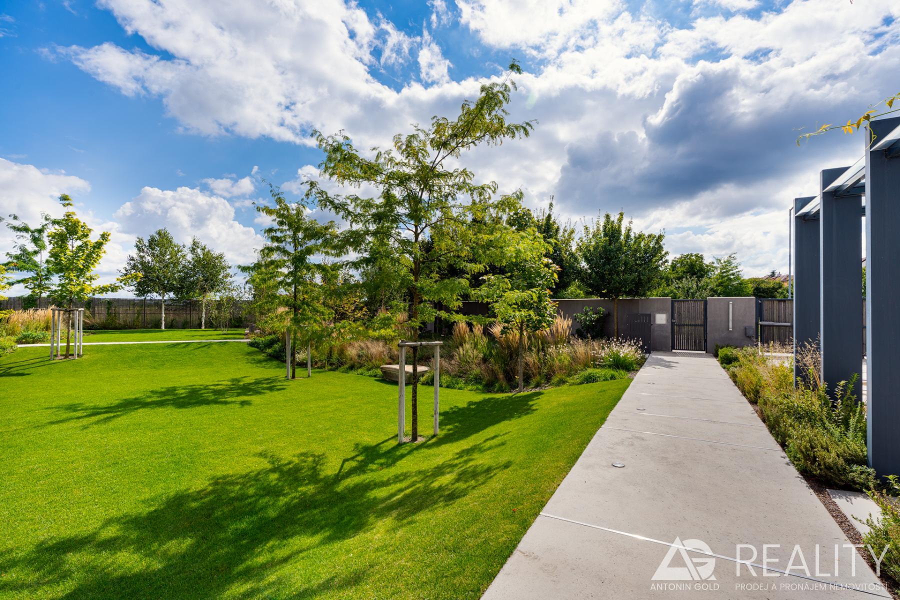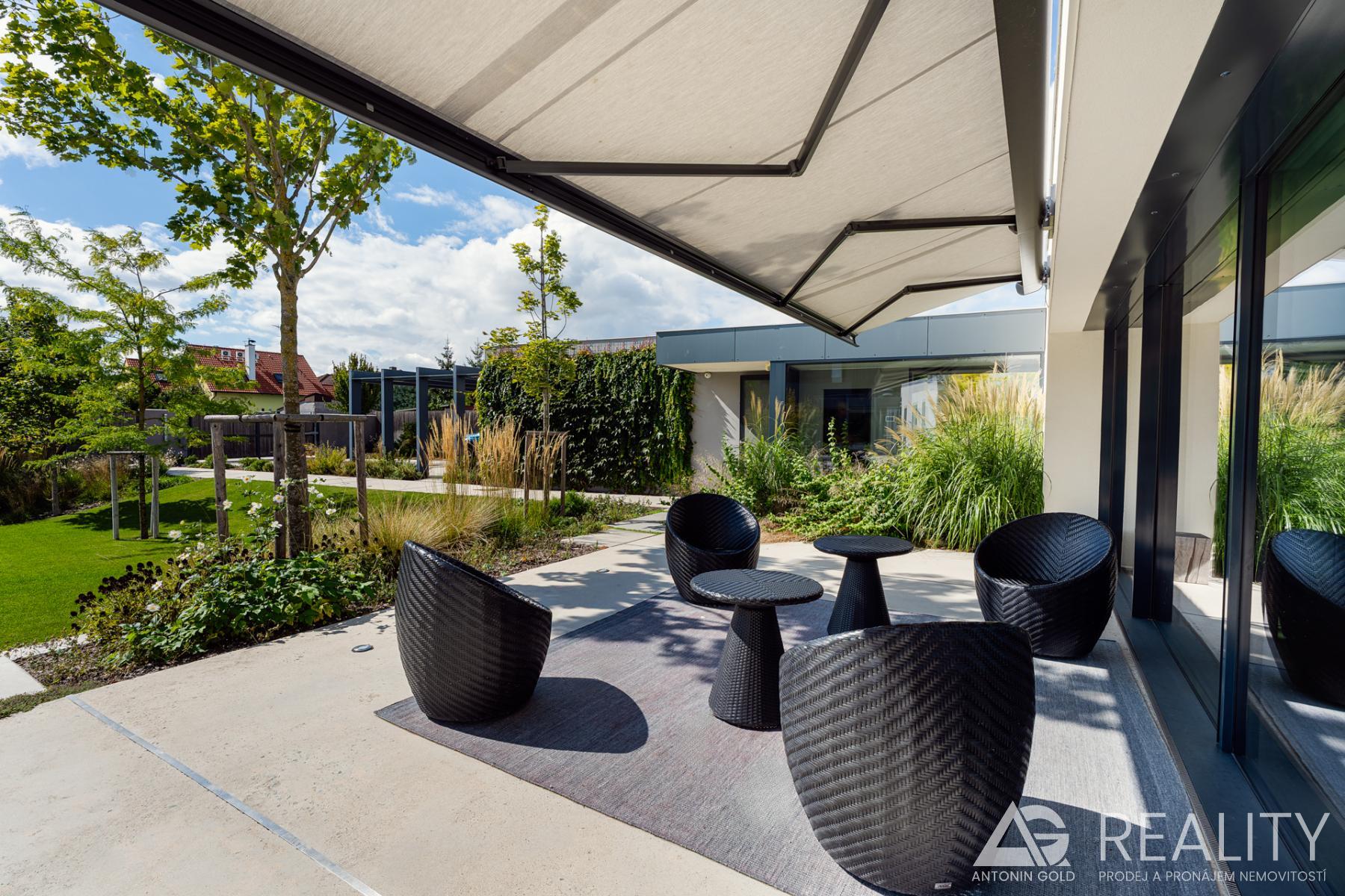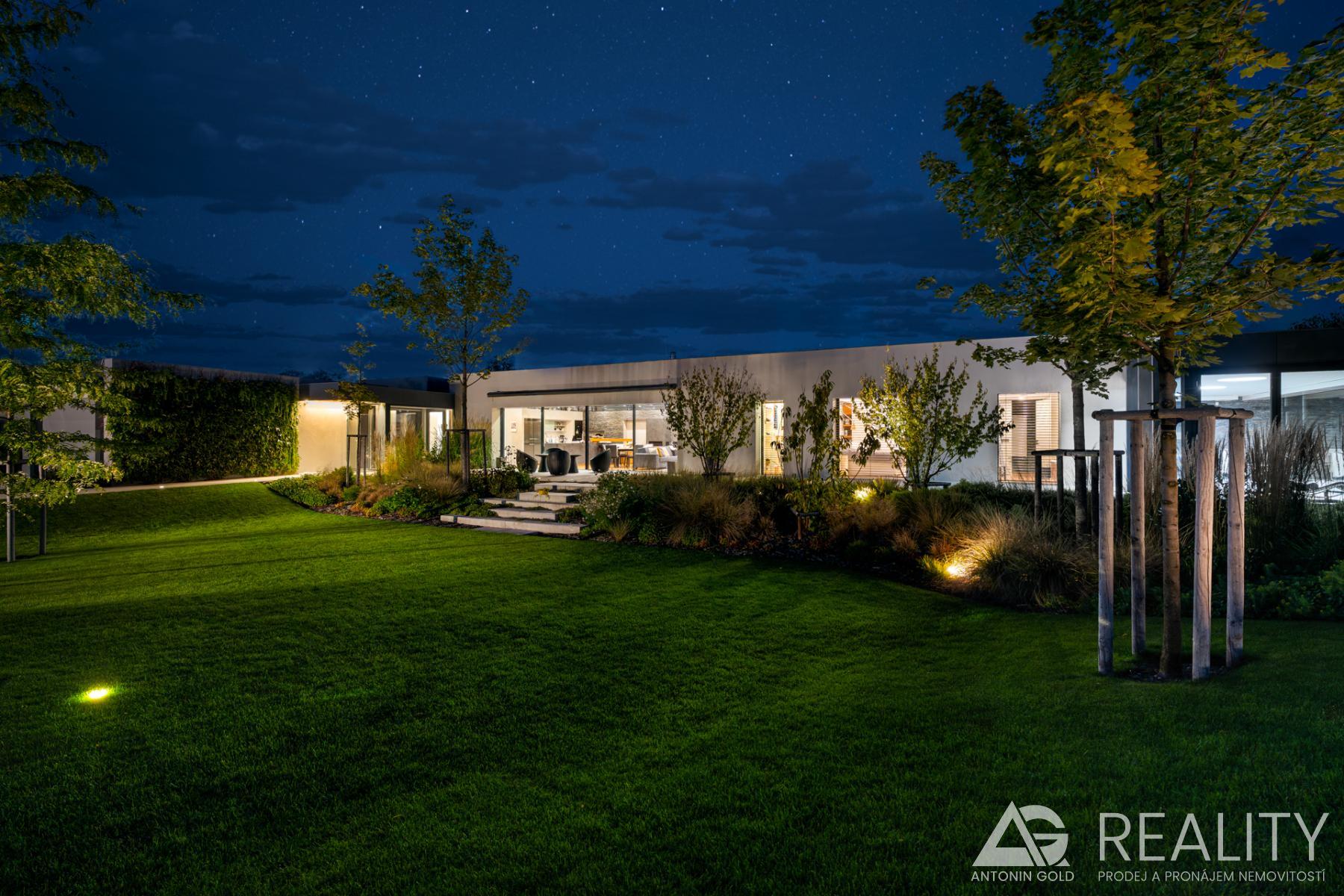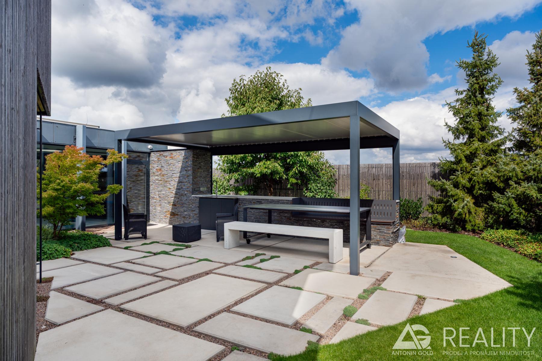 Součástí komplexu je také prostorná dvougaráž a zastřešené parkování pro další vozy, které podtrhují eleganci celého projektu.