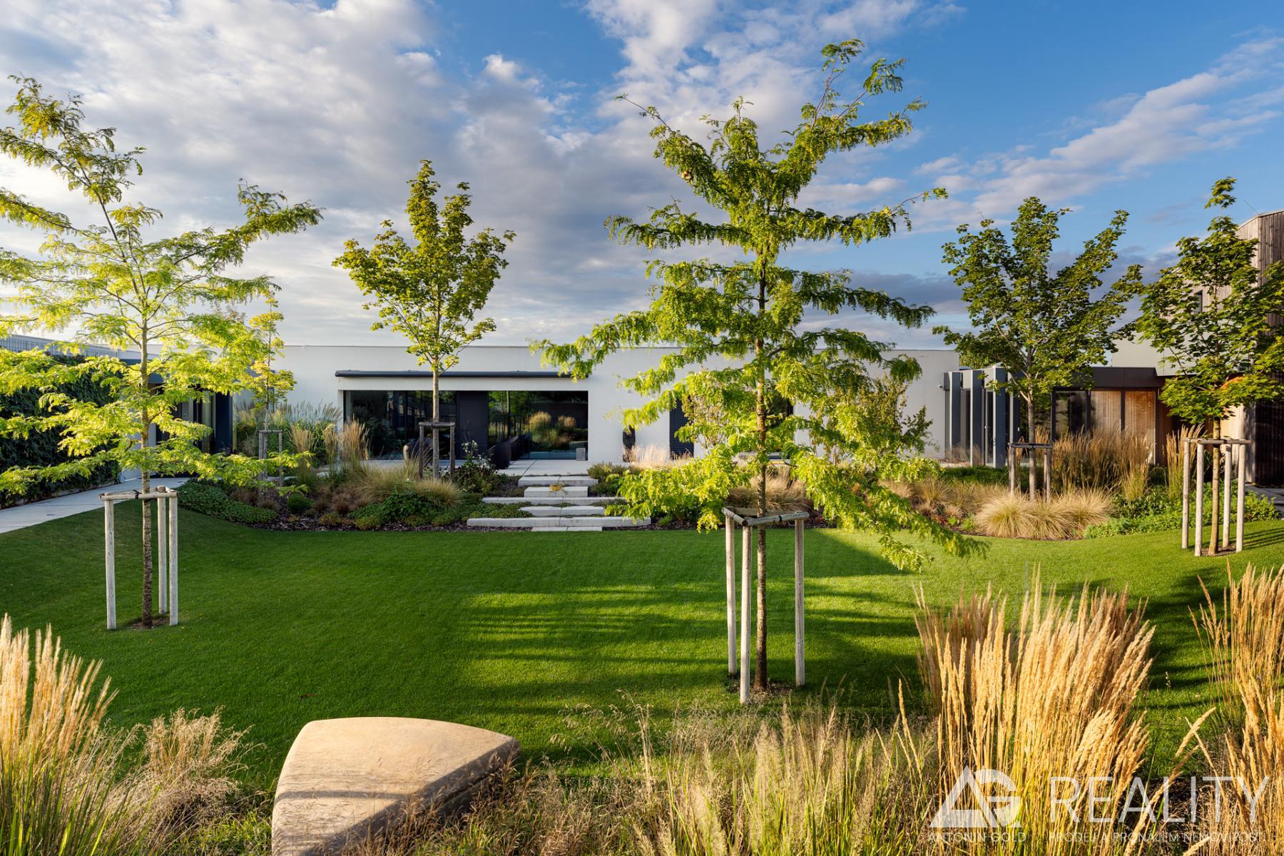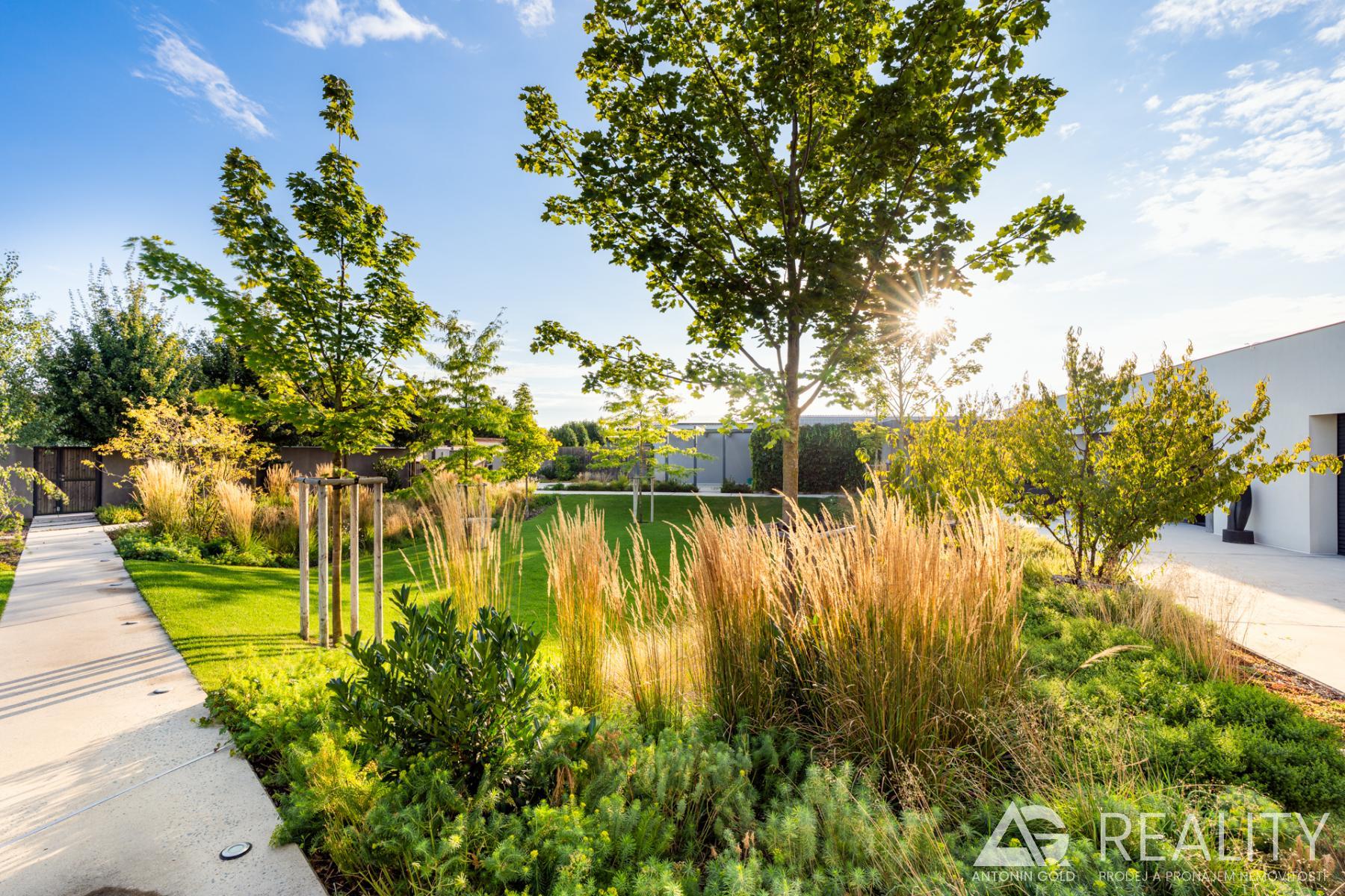 Na bazén navazuje společenská zóna s posezením, grilem, ohništěm a pergolou Sun Systém, dětské hřiště, trávník na míčové hry, relaxační kouty, designový zahradní nábytek Artie nebo venkovní stůl Graveli.