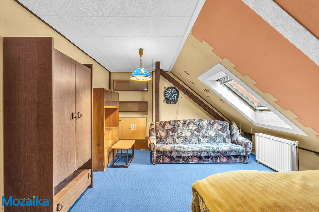 Co se týče dispozičního řešení, dům nabízí velmi zajímavou a praktickou koncepci. V suterénu najdete menší sklep, který poslouží k uskladnění potravin, sezónních věcí nebo jako technické zázemí. Přízemí je navrženo jako plnohodnotný obytný prostor s chodbou, samostatným WC, spižírnou, kuchyní, obývacím pokojem a ložnicí. Přístavba v přízemí pak nabízí koupelnu, další chodbu a praktické dveře vedoucí přímo do zahrady, což je ideální pro letní měsíce nebo pro rodiny s dětmi. V podkroví se nachází další obytná část s chodbou, která je nyní využívána jako kuchyň, a dva samostatné pokoje. K dispozici je také půdní prostor, který lze v budoucnu využít například jako další úložné prostory nebo jej případně zrekonstruovat na další obytnou místnost.