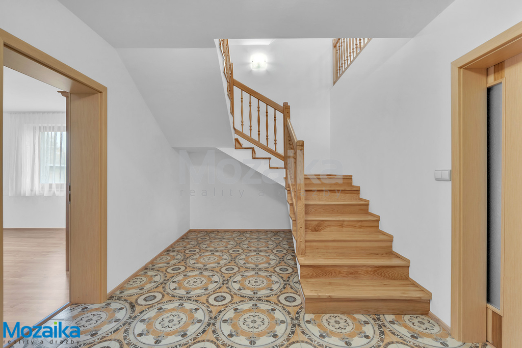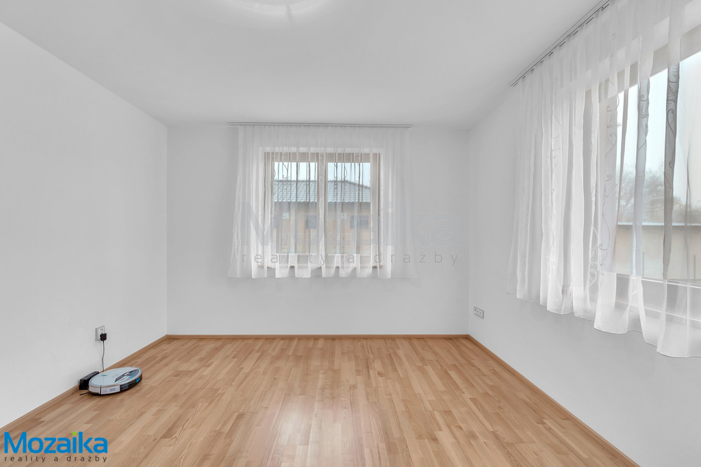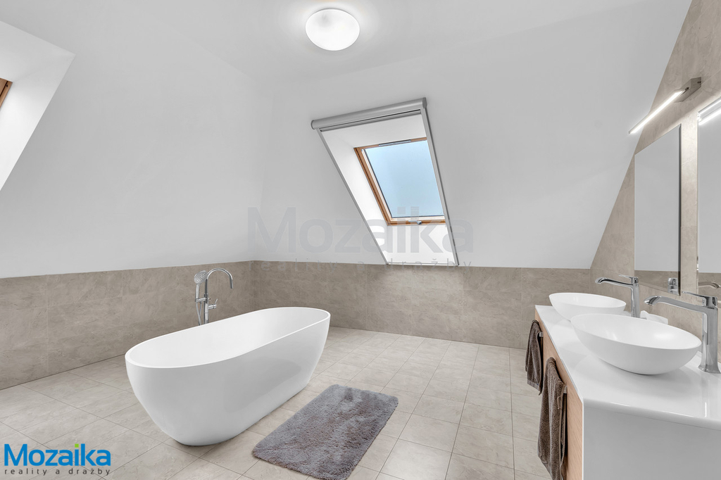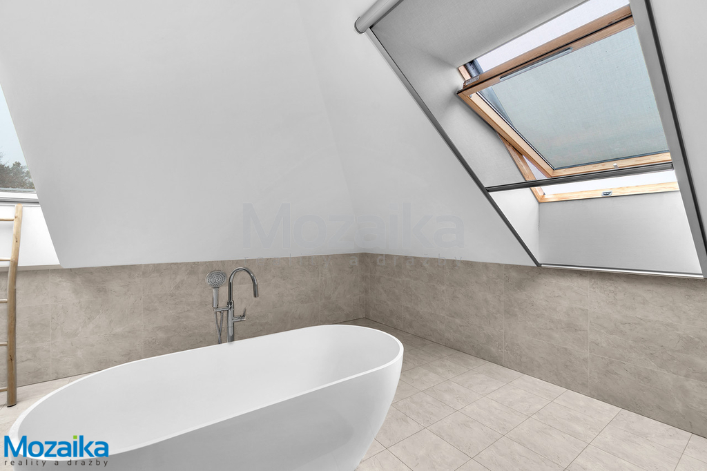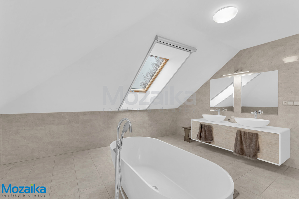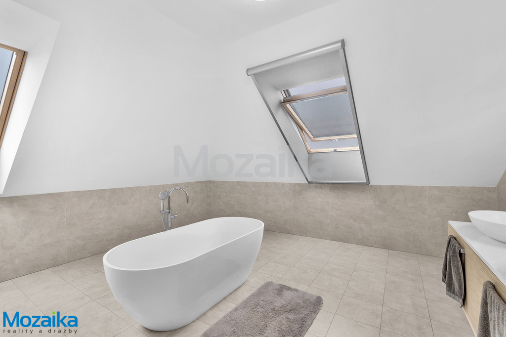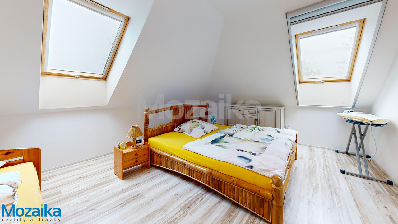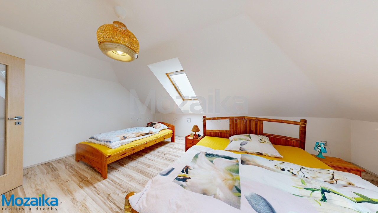 V podkroví se nachází chodba, prostorná ložnice, šatna, další pokoj, koupelna, samostatné WC a velká pracovna, která je přístupná přes garáž a nabízí tak možnost využití například pro kancelář, služby nebo domácí podnikání aniž budete rušit rodinu. Dům tak nabízí dostatek soukromí pro každého člena rodiny a flexibilitu využití jednotlivých místností podle vašich aktuálních potřeb.