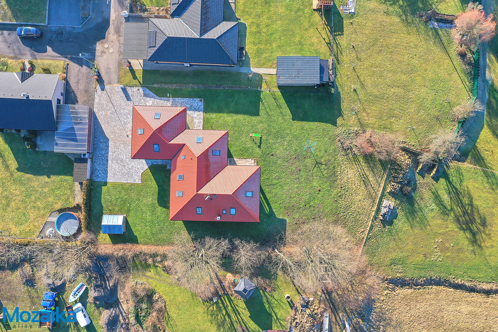 Tento prostorný, světlý a precizně postavený dům je ideální i pro větší rodiny hledající komfort, dostatek prostoru a soukromí pro každého člena domácnosti a kvalitní zázemí. Dům je nepodsklepený a disponuje obytným přízemím a podkrovím s velkorysou užitnou plochou 328 metrů čtverečních. Je postaven z vysoce kvalitních materiálů, což zaručuje dlouhou životnost a nízké provozní náklady. Energetická třída B je důkazem jeho nízkoenergetického charakteru, který vám ušetří nemalé finanční prostředky za energie.