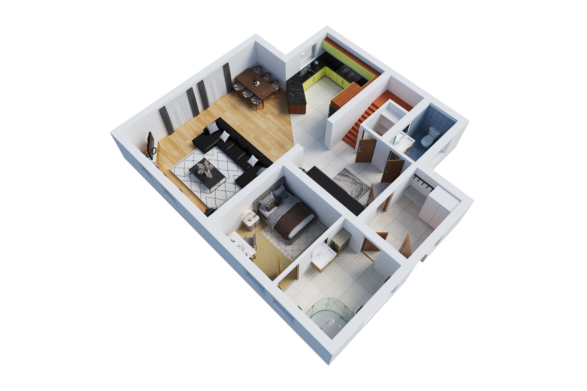 Velkou výhodou je promyšlená dispozice, která kromě hlavních obytných prostor nabízí i samostatný pokoj s vlastní koupelnou – ideální pro hosty, dospívající děti nebo práci z domova.