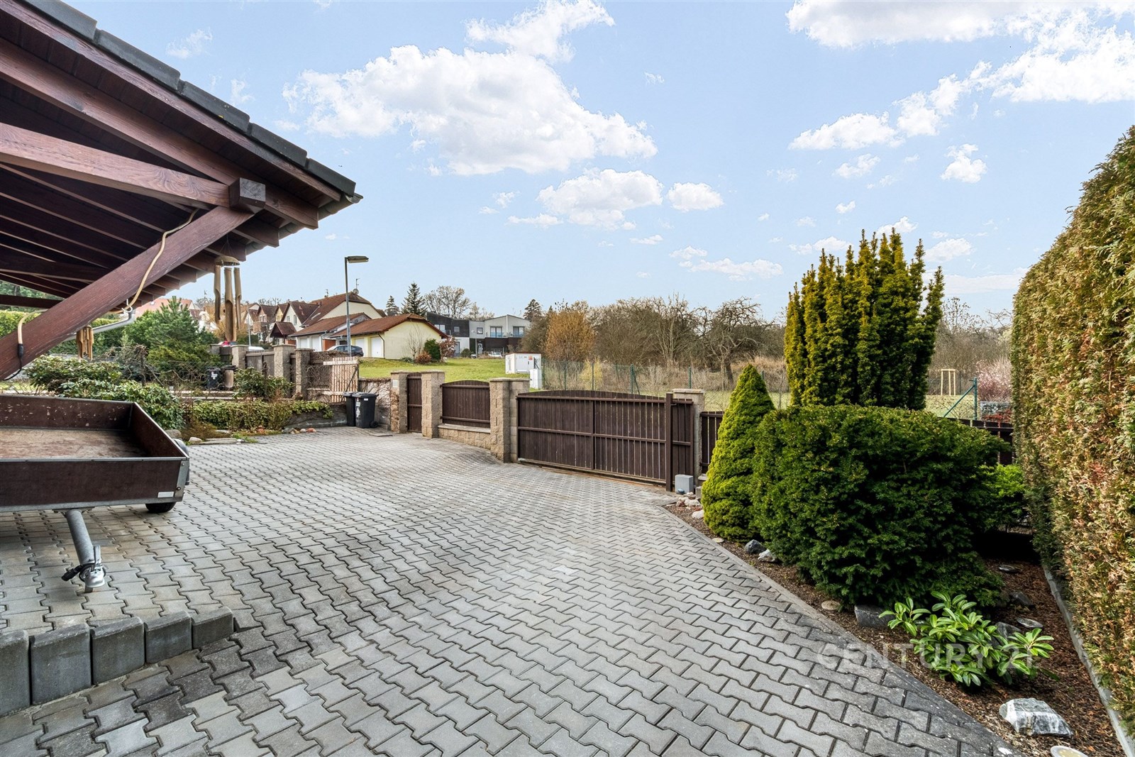 Na pozemku je zajištěno parkování pod pergolou i za automatickými vraty. Dům je napojen na veškeré inženýrské sítě – vodovod, kanalizaci, elektřinu i plyn.