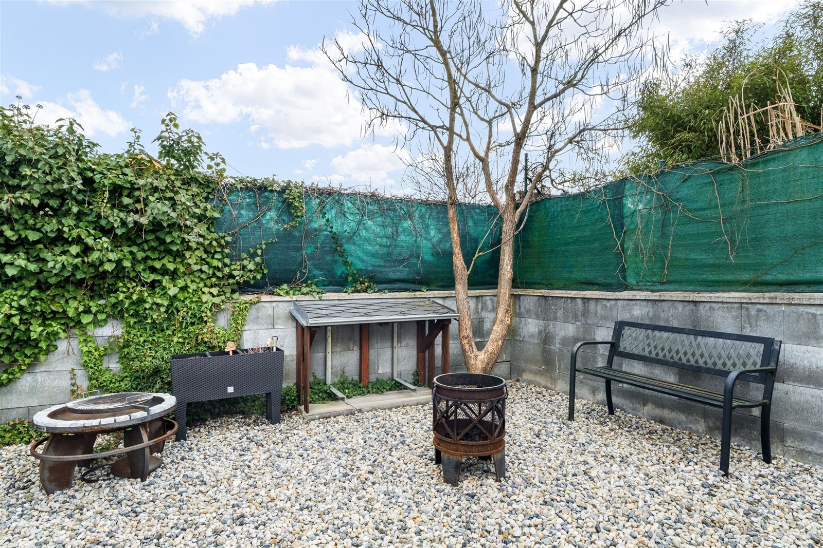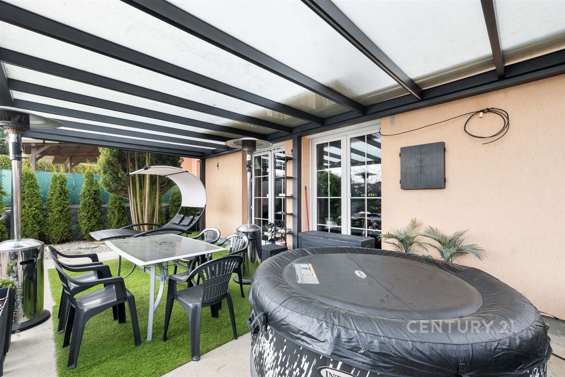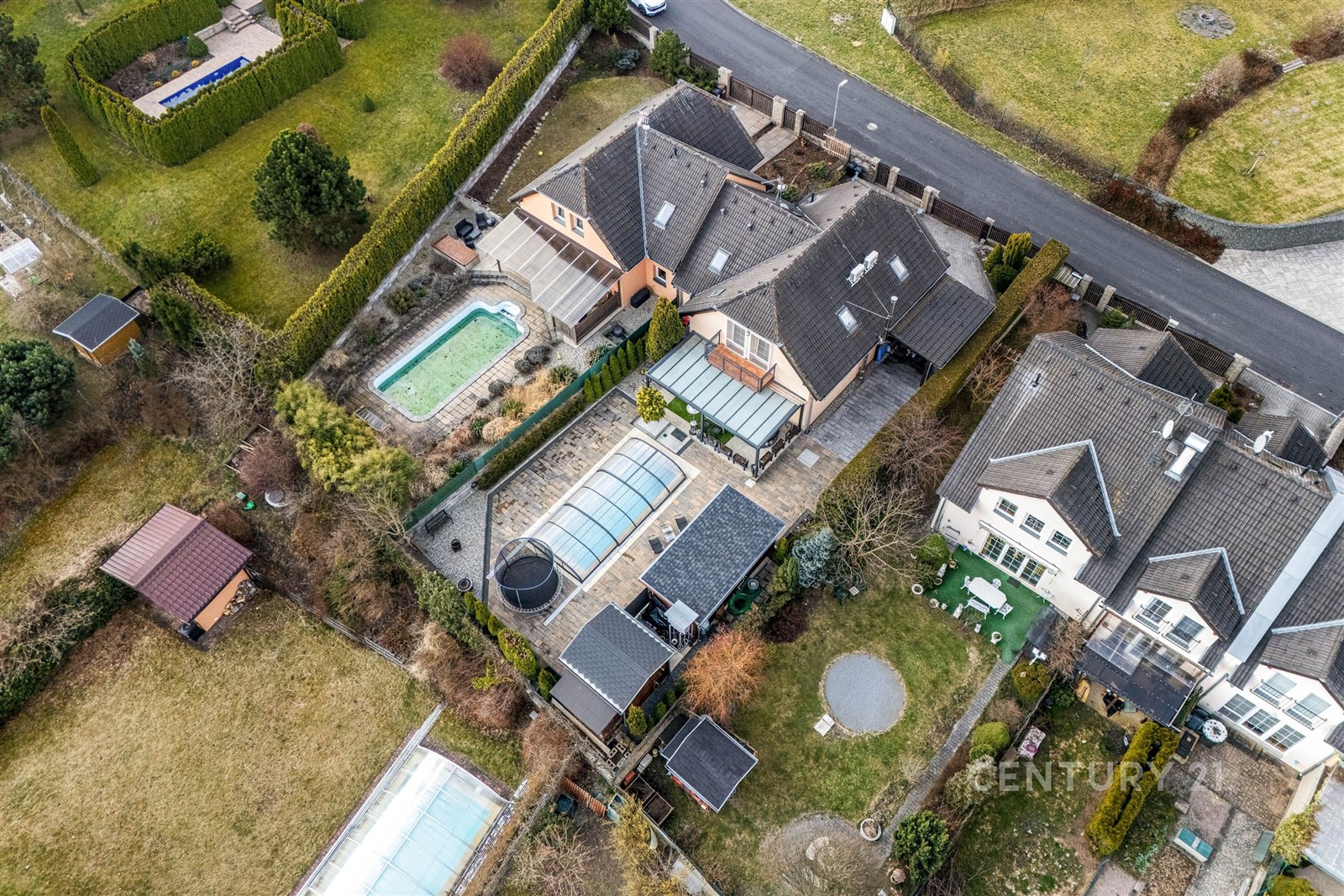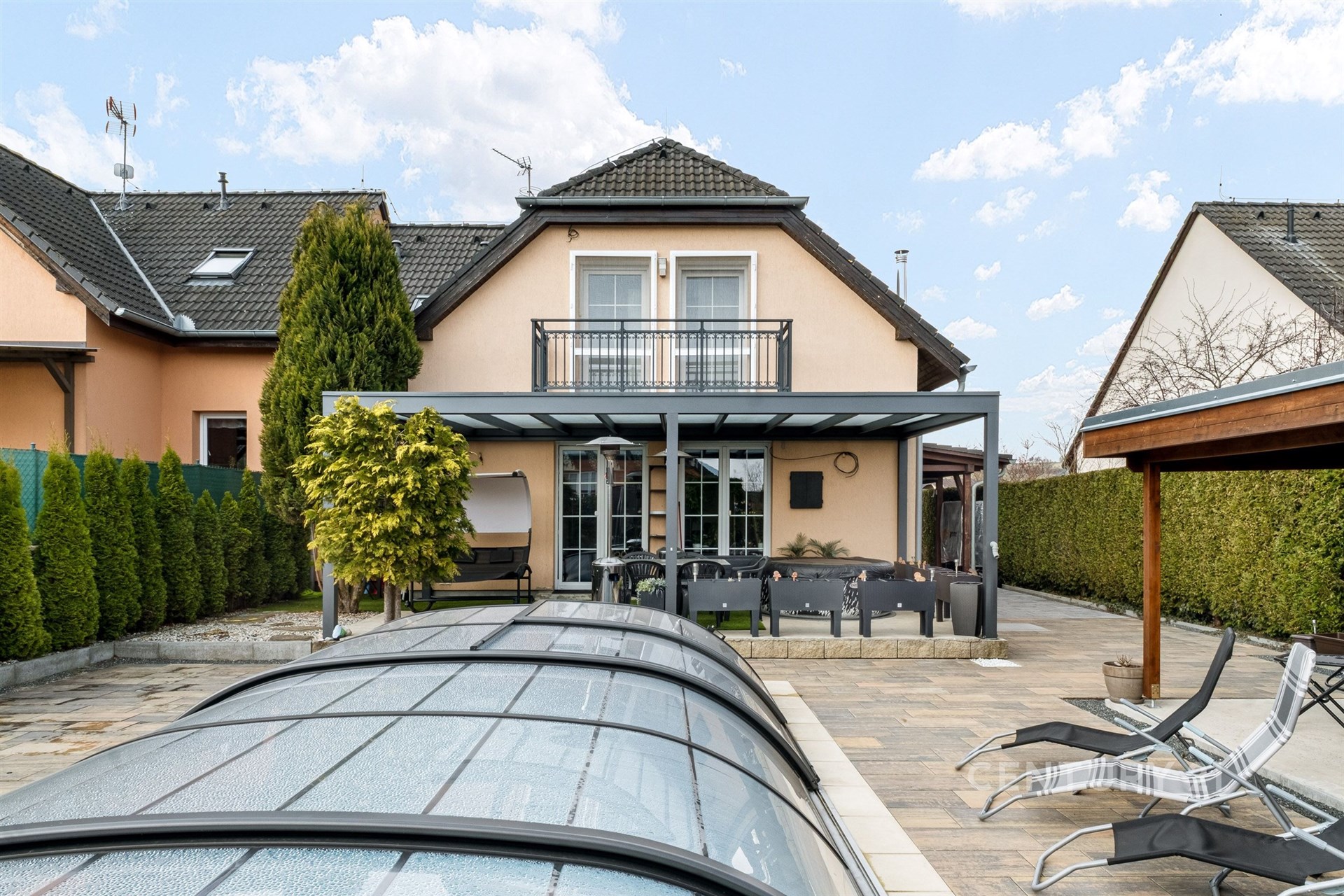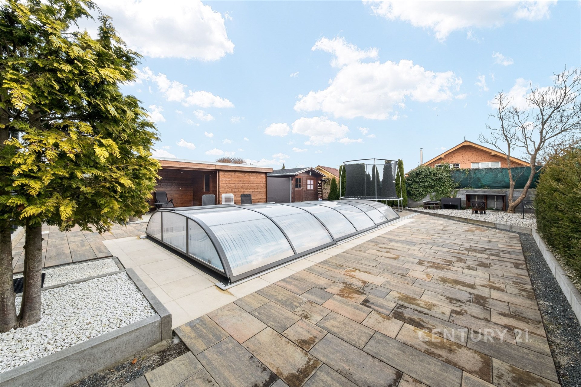 Zahrada je skutečnou oázou klidu a soukromí, připomínající malý soukromý resort. Dominantou je plně automatizovaný bazén (7 × 3 m) se slanou vodou, vyhřívaný tepelným čerpadlem. K dispozici je zastřešená terasa s potenciálem dalšího rozšíření, například o vířivku. Nechybí zahradní domek, prostor na dřevo ani samostatný objekt připravený pro vybudování sauny. Příjemné venkovní posezení s krbem přímo vybízí k relaxaci, grilování i setkávání s rodinou a přáteli.