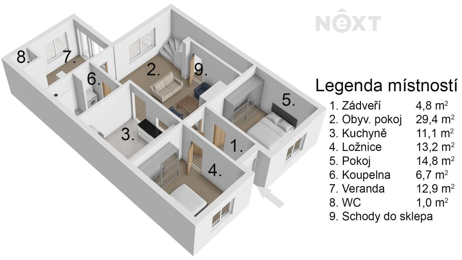 1. NP: zádveří (4,8 m2), obývací pokoj (29,4 m2), kuchyně (11,1 m2), ložnice (13,2 m2), pokoj (14,8 m2), koupelna (6,7 m2), veranda (12,9 m2), WC (1 m2), schody do sklepa