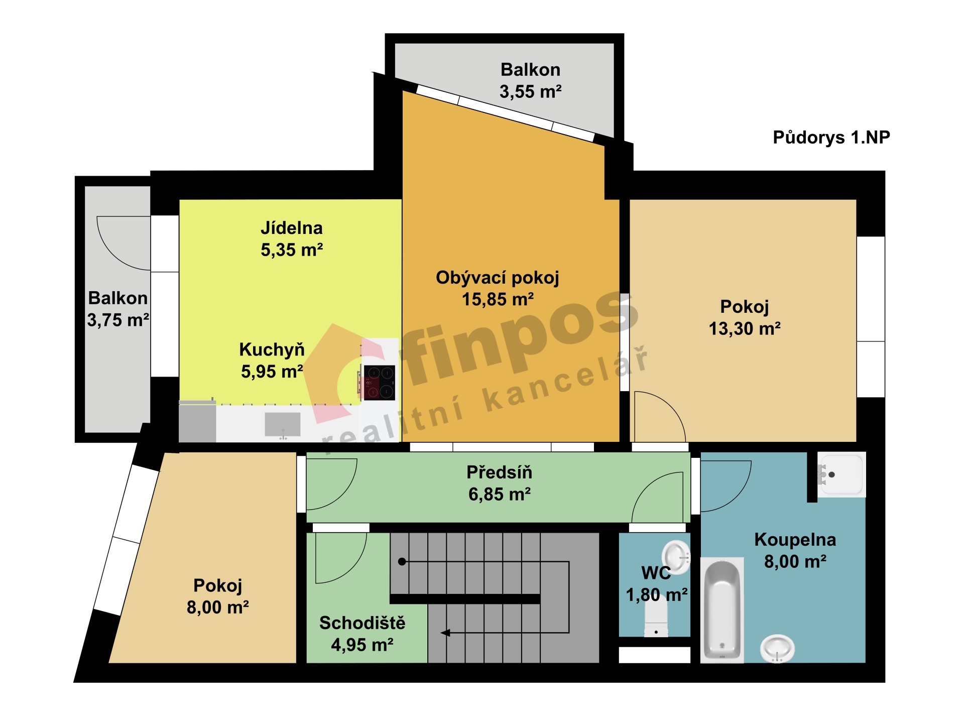 Balkony nejsou do ploch započítány, jsou v prvním a druhém poschodí, 3,55 m2 a 3,75 m2 na každém patře.