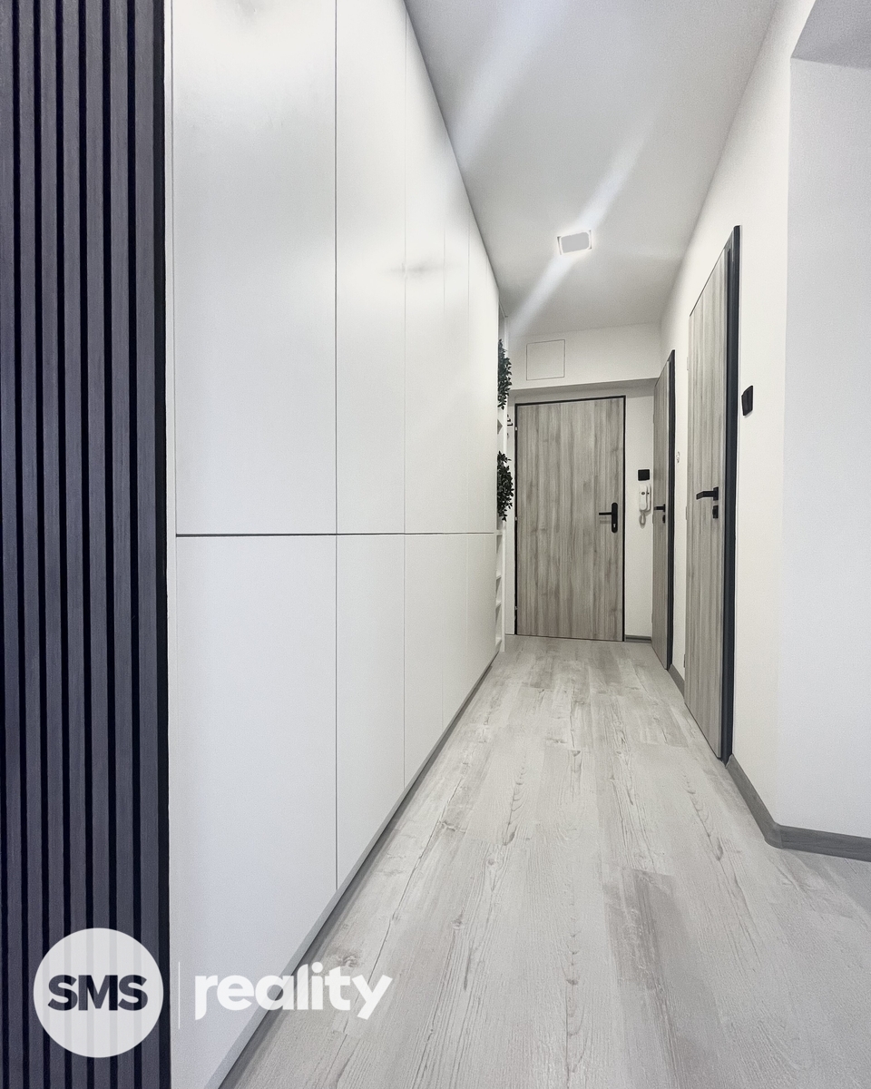 Předsíň nabízí dostatek úložných prostor ve vestavěné skříni. Z chodby se dostaneme do ložnice a dětského pokoje. Hlavní obytnou místností je prostorný obývací pokoj, který je ozvláštněn podhledy s LED televizí. Z obývacího pokoje je vstup na prosklenou lodžii. Byt se pronajímá bez vybavení.