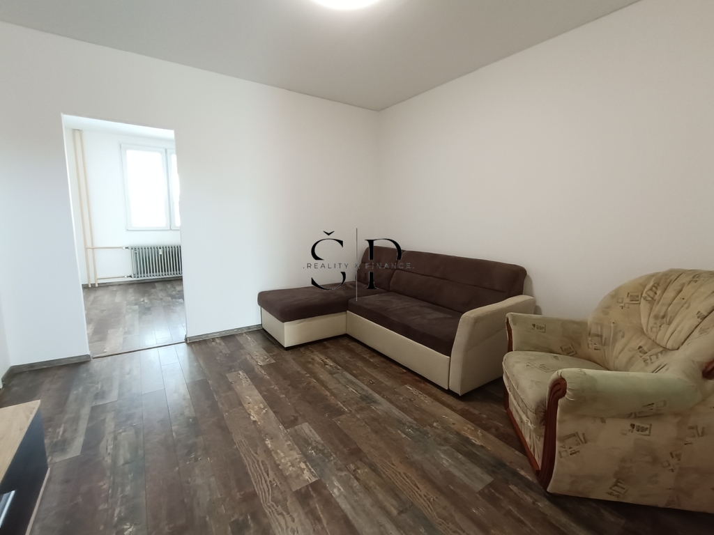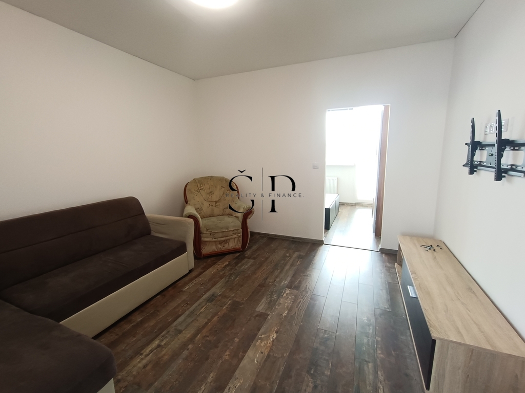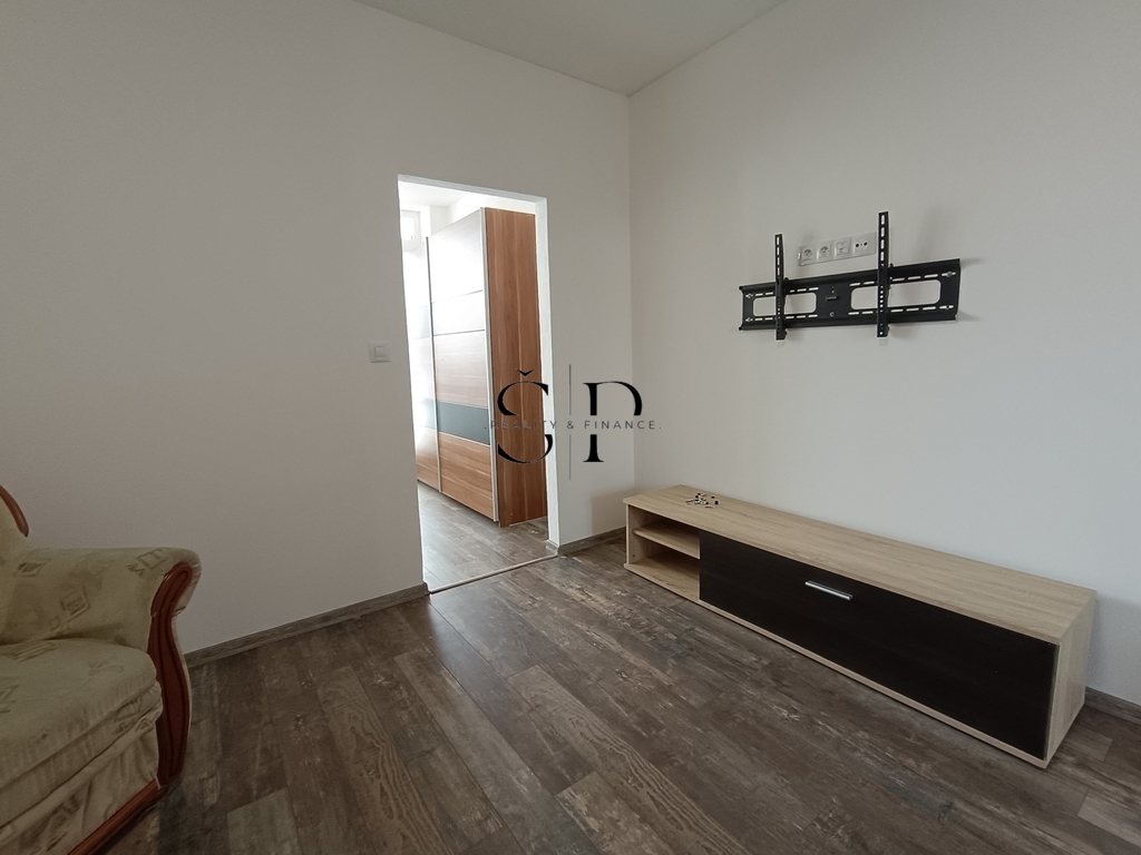 Z chodby se vstupuje do obývacího pokoje, který tvoří srdce bytu. Je vybaven pohovkou, křeslem a televizní stěnou ve světlém dekoru. Z obývacího pokoje je přístup do dalšího pokoje, který je bez vybavení. Dále je zde vstup do kuchyně s moderní kuchyňskou linkou a spotřebiči.