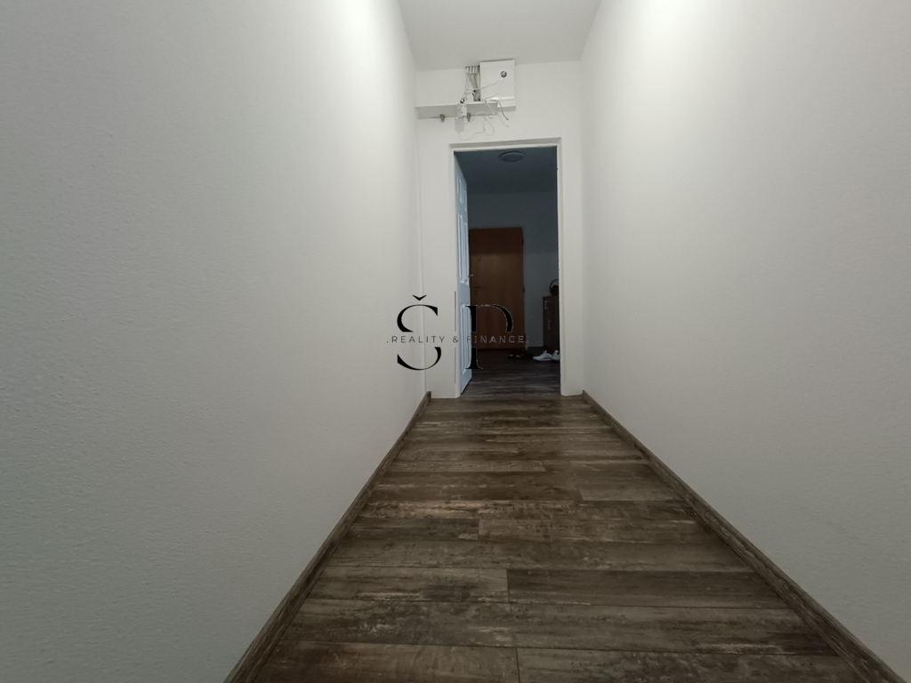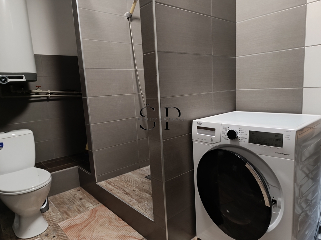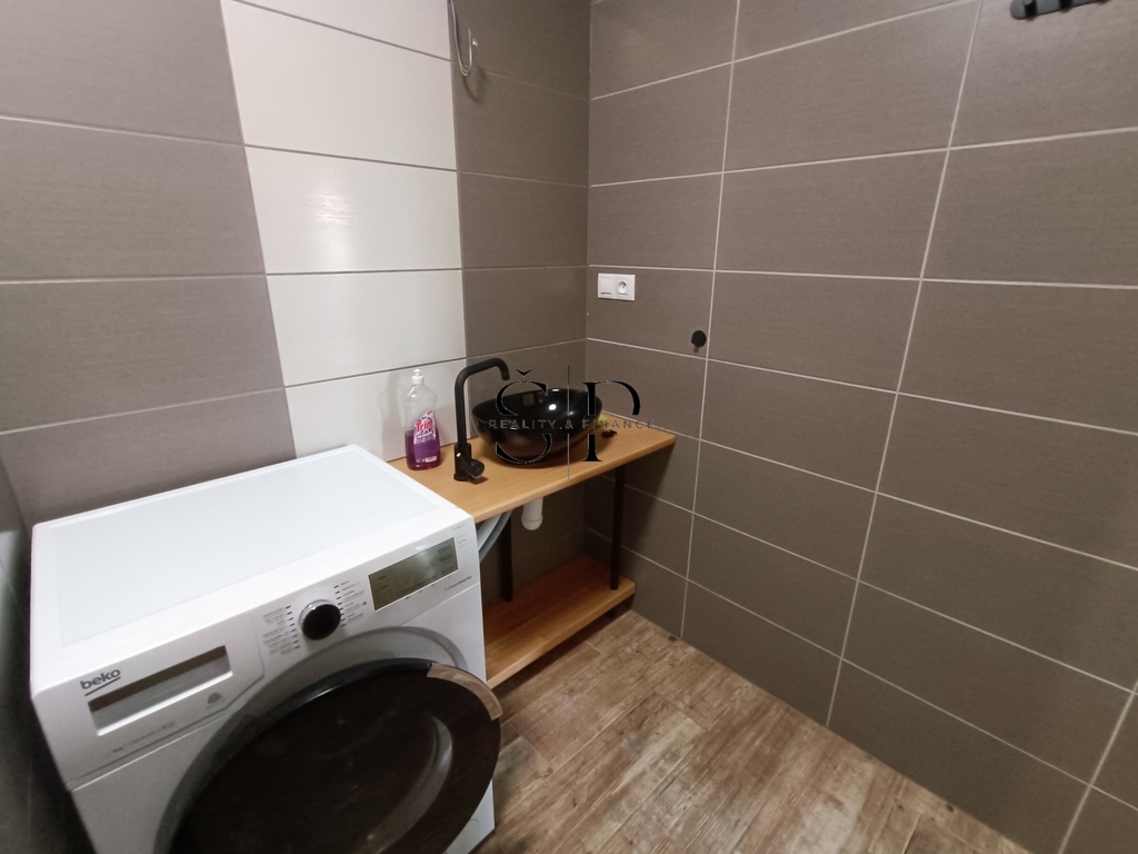 Dispozice bytu je prakticky řešena. Po vstupu do bytu se ocitnete v prostorné předsíni, ze které je vstup do jednoho neprůchozího pokoje, vybaveného dětskou postelí s úložným prostorem a televizí. Z předsíně dále pokračuje chodba, z níž je vstup do moderní koupelny se zděným sprchovým koutem, toaletou, umyvadlem a pračkou. V koupelně je rovněž umístěn bojler zajišťující ohřev teplé vody.
