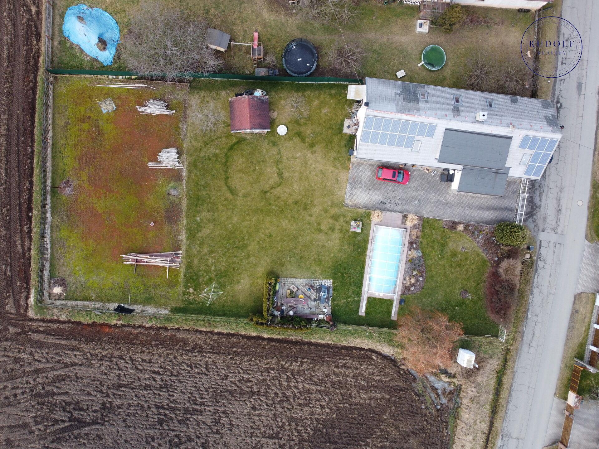 Zahrada je skutečným místem odpočinku – najdete zde krytý bazén pro letní osvěžení, antukové multi sportovní hřiště pro aktivní vyžití, studnu na užitkovou vodu i retenční nádrž pro efektivní hospodaření s dešťovkou.